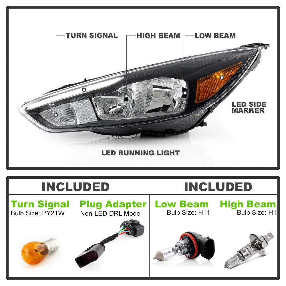 Document Compatible with For 2015-2018 Ford Focus ^Only Fits Halogen Headlight With LED DRL Models ^Not Fit Electric & RS Models Part Number ABPA PARTSLINK GM2502235, GM2503235 OEM 15287023, 15287024, 15851372, 15851373, 15207723, 15207724 HOLLANDER 114-00780L, 114-00779R TYC 20649300, 20649400 DORMAN 1591106, 1591107 DEPO 3351130LAS, 3351130RAS Features 1 Product Description Easy Installation Plug-n-Play Operation, Direct Bolt-On OE Fitment or Replacement for the Stock Unit. Product Durability: Advanced UV coating is applied on headlamp lens, to protect the lens from scratches and cracks as well as from UV rays. The comprehensive testing processes, ensure the resistance of leakage, corrosion, and rust, for longer service life. Comparable to OEM in breathability and structural integrity with features like a Gore-tex fabric membrane to allow moisture to escape but also repel liquid. Meets or exceeds applicable DOT/SAE standards and complies with the U.S. Motor Vehicle Safety Standard, FMVSS-108. DO HEADLIGHTS DIM OVER TIME you’ll discover that the haze is on the outside of the headlight cover, and is caused by environmental factors. Ultraviolet light from the sun is the leading culprit, followed by road salt and grime that interact with the plastic and cause it to lose its transparency. Headlights that fade over time are impossible to avoid, as it’s a part of how the components wear out, but it’s essential that you do something about it. By replacing the bulbs, installing new headlight lenses or getting new bulbs, you can ensure you’ll have a clear view of the road ahead. HOW DO YOU REPLACE A HEADLIGHT ASSEMBLY? Some headlights are part of an entire assembly, so you can’t simply change the bulb. If you need to replace the entire headlight assembly, it shouldn’t take long with most car models. If the job is straightforward, you are looking at less than an hour. However, your model might require that the entire front-bumper fascia be removed—or at least loosened—to reach the headlight assembly. For example, replacing the headlight on a Toyota Camry, Chevy Malibu, or Ford Fusion might be more challenging. It requires extra time, so give yourself at least two hours if you aren’t experienced. Before you start, we recommend two things: Buy a repair manual for your vehicle. Watch YouTube videos specific to your model and year. These will help you understand the specific steps required for your model. Here are essential pointers for swapping headlight assemblies. Only work on the headlight assembly while the car is off, and the keys are out of the ignition. Remove all bolted- or clipped-on connections, including the wiring harness connected in the back. Place any small pieces in a safe location for reassembly. Once you connect the new headlight assembly, try it before putting everything back together. Use the low and high beams to ensure everything is working. Remember also to check the aim of the headlights using our guide to adjusting headlights. Moisture in Headlights What Can You Do About It? Usually, when you turn the headlights on, the heat causes the moisture to evaporate. It can also evaporate on its own over the course of the day, as the sun warms things up enough to do the same job. Driving the car can also help, as it allows air to pass through the vents in the light housing and clear out the moisture, much like running the defroster in your car’s cabin clears the windshield. Moisture in Headlights Doesn’t Have to Mean It’s Time for Replacement Ventilation = Condensation Since most headlights generate heat, they need to be ventilated, which means that they feature small vents that can suck in moisture when the car is turned off. If the outer lens cools more quickly than the air inside the headlight unit, it can cause condensation. This explains why you most often encounter condensation in the morning after your car has been parked overnight. Moisture in headlights can be a frustrating problem: Fogginess affect the amount of light the unit projects. It can also cause corrosion over time inside the assembly. Is It Time for a Replacement? If you’re seeing more than a normal amount of moisture in your headlights, or if you’ve noticed more water inside the housing after a rain storm, you could be dealing with a cracked headlight or a problem with the rubber gaskets that seal it to the body. Most of the time, gaskets can be replaced individually, but if the headlight housing is cracked, then you’ll most likely have to replace the entire unit. Prevent Further Moisture: There’s a number of products that can help you recreate a firm seal. inspect the seal for any damage or debris. If necessary, run a bead of silicone sealant around the factory seal area to ensure no moisture can enter the assembly replace the seal if your housing uses a replaceable seal. You’ll also want to check the O-rings that protect the electrical connectors, bulb, vent and other components of your headlight assembly. On Sep 18, 2024 at 20:49:52 PDT, seller added the following information: On May 26, 2025 at 19:37:40 PDT, seller added the following information: