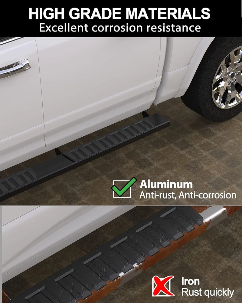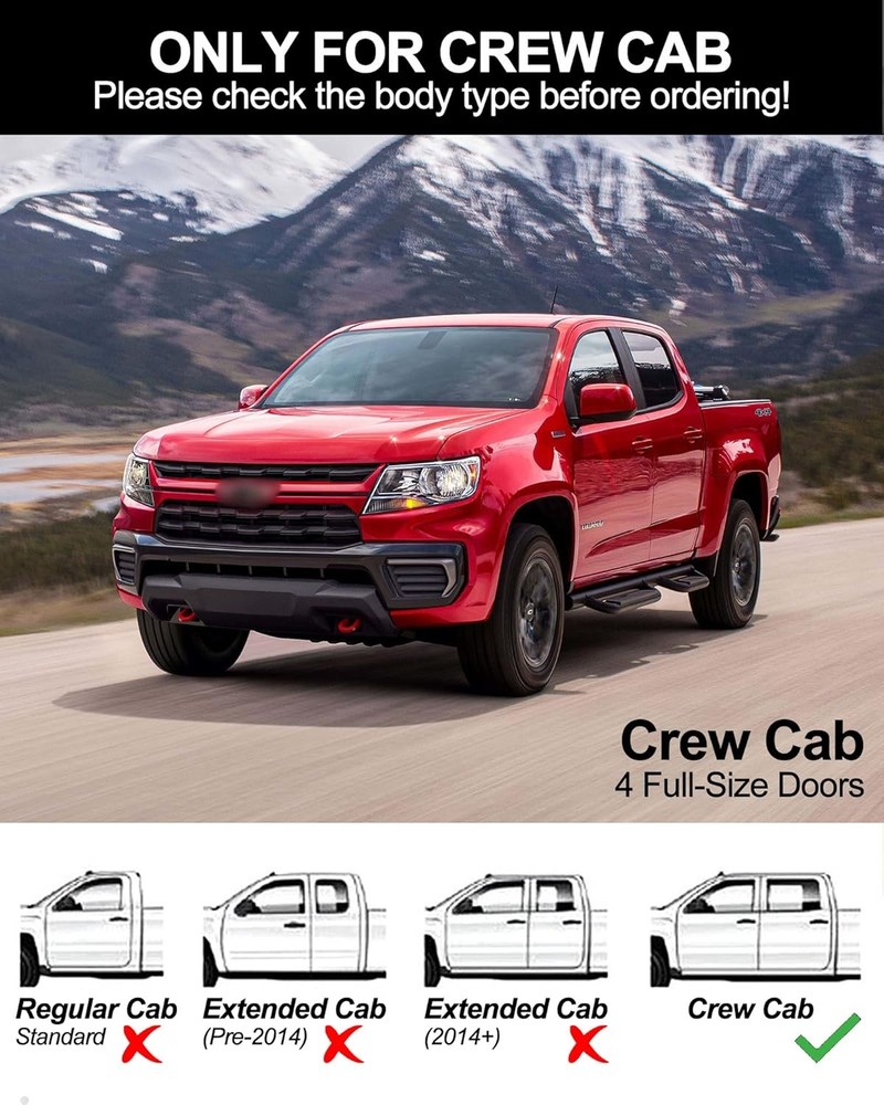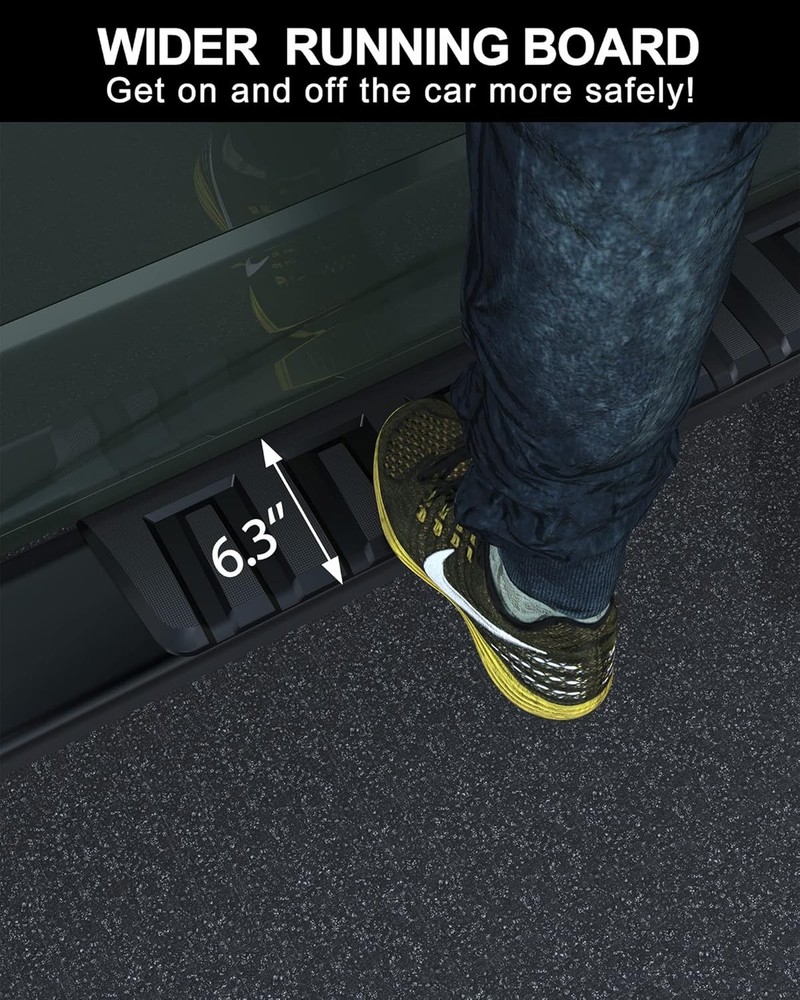 These running boards are a perfect addition to my Chevy Colorado! The sleek black aluminum looks great and feels sturdy. The non-slip pads make stepping in and out easy, even in bad weather. Installation was straightforward, and they fit like they were made for my truck. Love the textured stainless steel skirt—adds a rugged yet polished look. Highly recommend for anyone wanting both style and functionality!