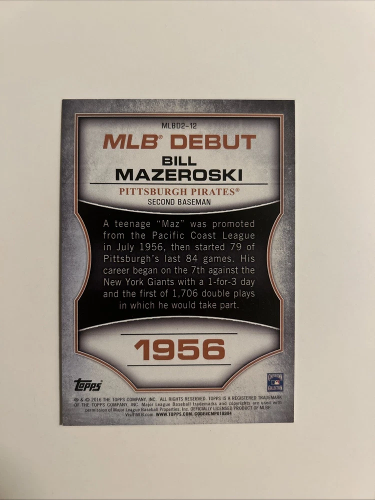 This 2016 Topps MLB Debut Silver trading card features Bill Mazeroski of the Pittsburgh Pirates. The card is an original and comes from the Major League (MLB) league. It is a sports trading card with a silver parallel/variety and is part of the 2016 Topps MLB Debut Silver set. The card number is MLBD2-12 and it was manufactured by Topps in 2016. The card is an insert and is not autographed. It is a great addition to any baseball fan's collection.