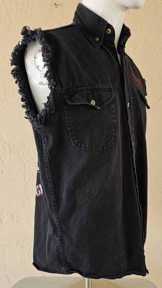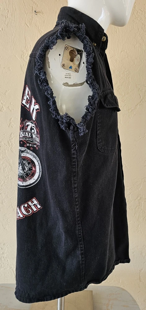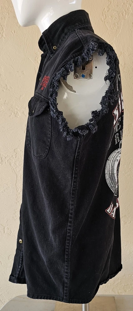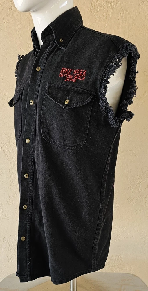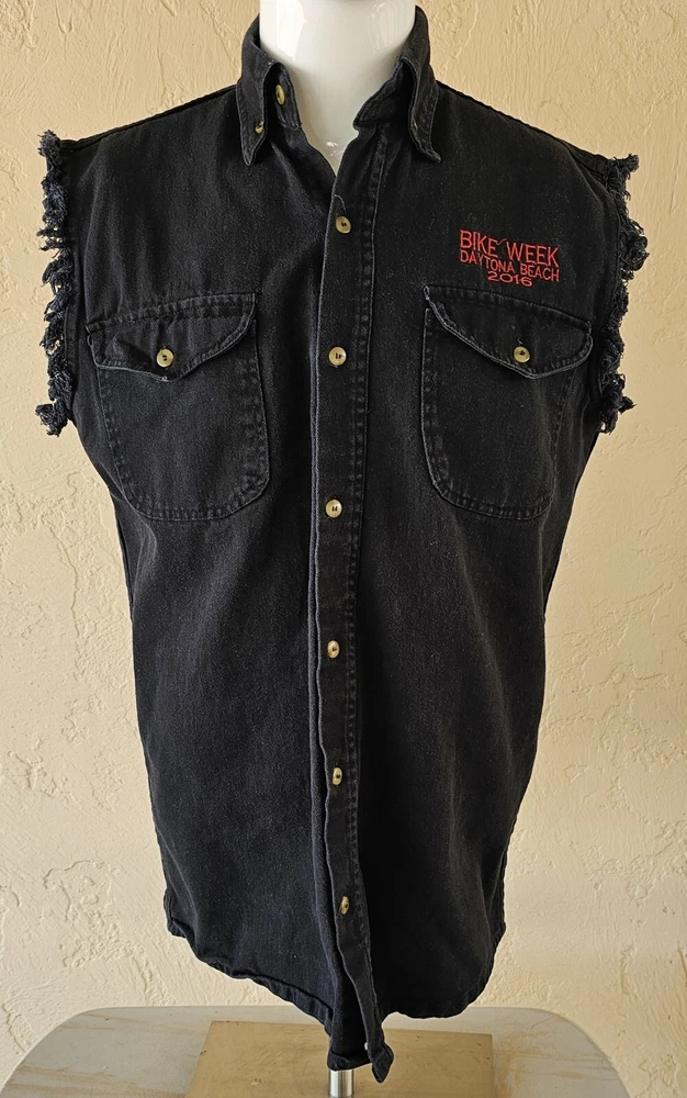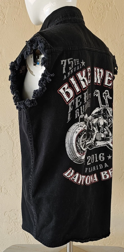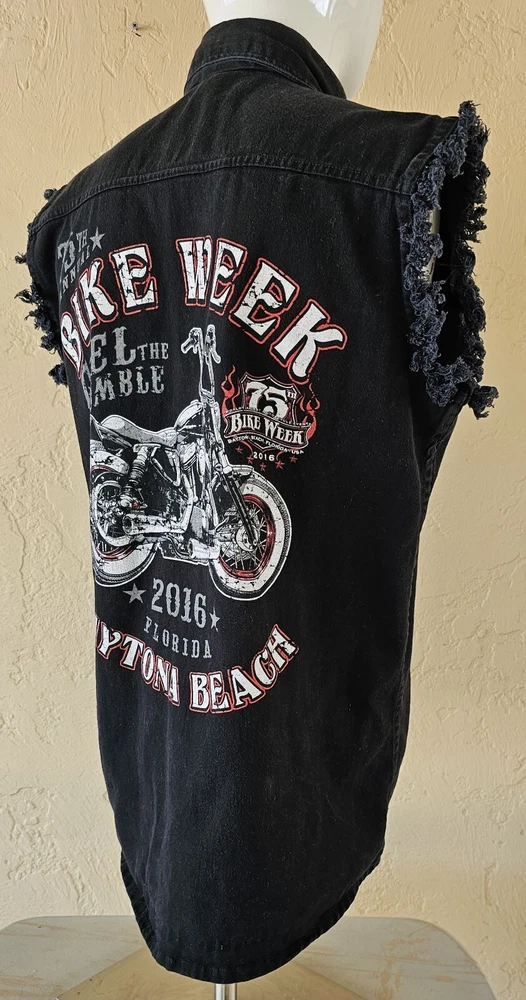 DESCRIPTION: 2016 Daytona Beach Florida Bike Week 75th Annual 'FEEL THE RUMBLE' Men's Harley Davidson Style Sleeveless Black Denim Motorcycle Vest in Size XL. THIS WAS WORN ONE TIME AND HAS BEEN SECURELY STORED EVER SINCE. IT'S IN EXCELLENT PRE-OWNED CONDITION! NO HOLES, STAINS, FRAYS, ODORS, ETC. This comes from a smoke-free and pet-free home. This will arrive fully washed, sanitized, and ready to wear or display. (See photos for details and condition) MEASUREMENTS/SIZING: No tag, unbranded. Fits and measures like an XL. Underarm to underarm/pit to pit (laying flat): 23" Length (laying flat) Neckline to bottom hem: 31" DISCLAIMER: Please review the measurements and photos very carefully. This is a used shirt, and some light wear/fading should be expected unless otherwise noted. Please ask any and all questions prior to purchasing. This is being sold as-is, and no returns are accepted. SHIPPING: Fully secure and insured shipping via USPS Mail. I SHIP FAST!! Please check out my other items for more awesome, vintage clothing and unique merchandise!!! Thanks for looking!