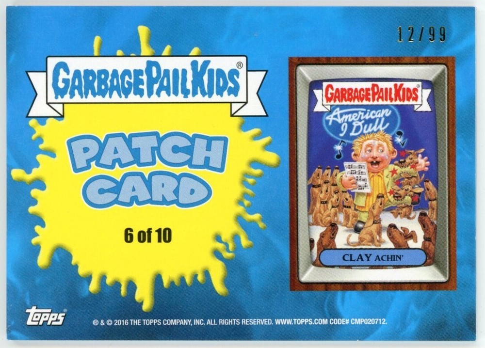 Card: Clay Achin' Card #: 6 Type: Patch Card Release Year: 2016 Series Release: GPK Prime Slime Trashy TV: Patch Card Subset Special Notes: #12/99 Numbered card. Condition: Very clean, kept toploaded. Scanned photos show the actual card you will receive.