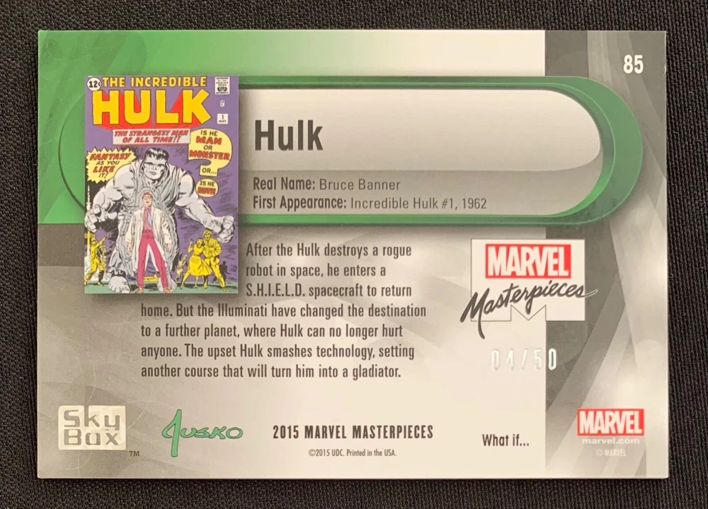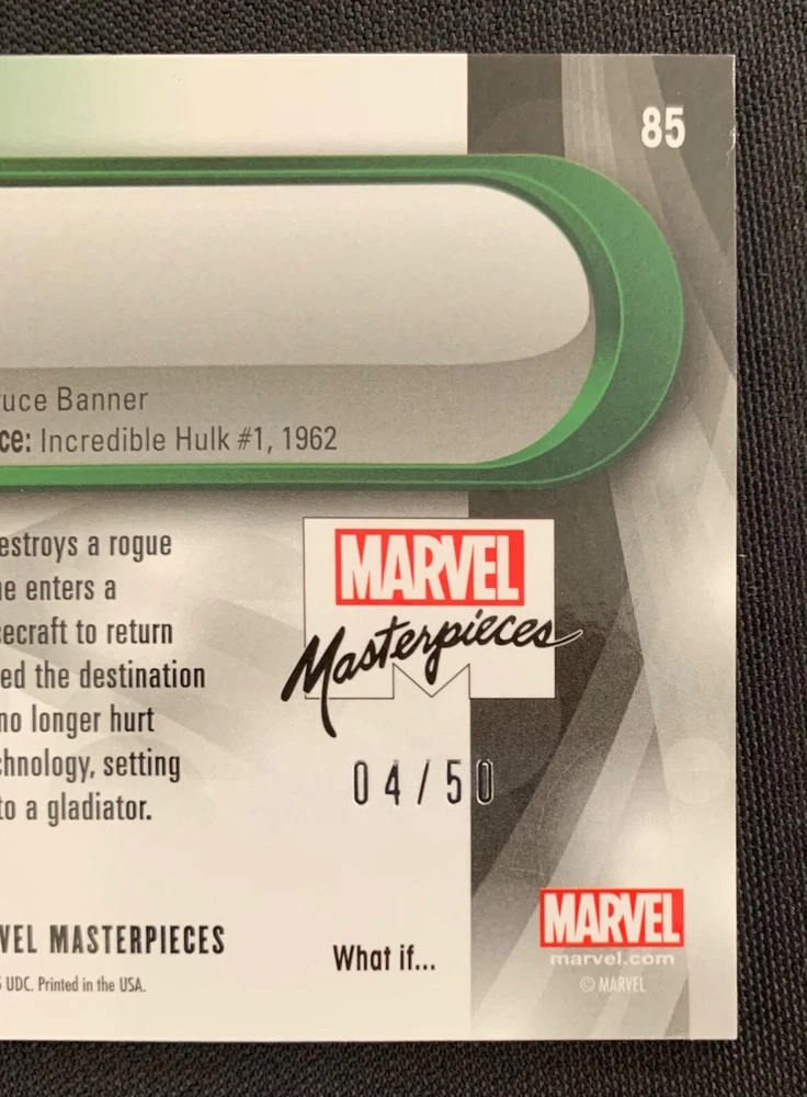 2016 MARVEL MASTERPIECES # 85 HULK WHAT IF PARALLEL CARD. CASE HIT 04/50 TIER (LEVEL) 4 CARD IS IN GREAT CONDITION NM/M CONDITION OR BETTER. ALL MY ITEMS COME FROM A SMOKE-FREE HOUSE. SHIPMENT WILL BE SENT IN 2 DAYS OF PAYMENT. I WILL SHIP THIS CARD IN THE GREATEST OF CARE. BUYERS OUTSIDE OF THE CONTINENTAL U.S. MAY HAVE TO PAY EXTRA FOR SHIPPING. I DO OFFER COMBINE SHIPPING RATES. SO PLEASE CHECK OUT MY OTHER ITEMS . FEEL FREE TO MESSAGE ME WITH ANY QUESTIONS. THANKS FOR LOOKING AND GOOD LUCK.