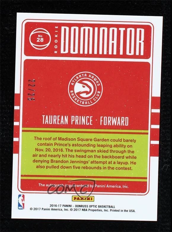 2016-17 Panini Donruss Optic - Rookie Dominator Signatures #28 Taurean Prince Qty Made: 25 - Rookie - Basketball Card - Featuring the Atlanta Hawks - Featuring Taurean Prince Search for more: 2016-17 Panini Donruss Optic Search for more: 2016-17 Panini Donruss Optic - Rookie Dominator Signatures View all of our Listings Auctions Buy It Now About Us Located in the beautiful Pacific Northwest, COMC (Check Out My Cards) is the world's largest consignment service for trading card singles. More than 10,000 people have used our consignment service to list over 50 million trading cards. Find out how we can help you consign your items on eBay by contacting us through eBay messaging. COMC -- "The Safe & Easy Way to Buy & Sell" Representative Image - Select Specific Item above to see image of actual item Representative Image - Select Specific Item above to see image of actual item Raw Condition for Modern Cards Unless otherwise noted, raw modern cards are listed in Near Mint-Mint condition or better. A NM-MT card appears to be Mint at first glance, but upon closer inspection, may exhibit some of the following: minor print defects (e.g. roller marks, print line, dimple), minor scratches, slight edge wear, and slight corner wear. Centering is clearly visible in the images provided and does not factor into our condition assessment. Raw Condition for Vintage Cards Unless otherwise noted, raw vintage cards are listed in Excellent condition or better. An EX card may exhibit some of the following: minor rounding of corners, surface wear, print defects, light scratches, and slight edge wear/chipping. Centering is clearly visible in the images provided and does not factor into our condition assessment. Domestic Shipping Combined shipping for multiple items is available. To receive combined shipping, please ensure all desired items are in your eBay shopping cart before proceeding to checkout. eBay limits orders to 40 items per order. We automatically combine multiple orders placed on the same day. If you place multiple orders on the same day, please contact us to request a refund of applicable shipping costs. Signature confirmation may be required on invoices over $400. All cards are protected and shipped securely. International Shipping COMC offers eBay's International Shipping (EIS) for international orders under $2,500* (see country exceptions below). All duties and import fees are paid at checkout; in the rare event that there are additional import fees upon delivery, these are borne by the buyer. EIS packages route through a shipping hub in Erlanger, KY before shipping to their final destination. Please note that EIS does not allow for combined shipments. The shipping rates are determined by eBay and cannot be adjusted. *Maximum sale price exceptions: Colombia, Kuwait ($2,000); Taiwan ($1,539); Chile, Costa Rica, Guatemala, Honduras, Trinidad and Tobago ($1,000); Antigua and Barbuda, Aruba, Belize, Dominica, Grenada, Philippines, Saint Kitts and Nevis, Saint Lucia, Montserrat, Turks and Caicos Islands ($500); Dominican Republic, El Salvador ($200). Please request a shipping quote through eBay messaging for orders that exceed the maximum sale price supported by eBay's International Shipping. You will be responsible for all duties and import fees for international orders shipped outside the EIS. All cards are protected and shipped securely. Payment COMC does not accept offers on our cards through our eBay storefront. COMC utilizes eBay’s managed payments system. If you are experiencing difficulties making a payment, please contact eBay for assistance. Return Policy Returns are only accepted on the rare occasion the item is not as described. If you are making a return, please initiate the return process through eBay so a mailing label can be provided for you. Prior to listing, our expert team carefully assessed this item to represent it accurately. Please review the description and high-definition images prior to purchasing to ensure this item meets your satisfaction. We welcome you to contact us if you have further questions about this item. Trust and Integrity COMC carefully assesses each item consigned to us to prevent fraudulent items from entering the marketplace. If you believe an item offered on COMC may be fraudulent, please contact us with details so we can investigate the issue. Items we determine are outside our supported items policy may be removed. Last Modified: 1/31/2025 10:17:39 PM PDT