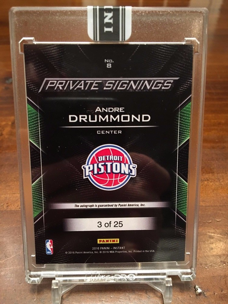 You are bidding only on the card(s) listed in the title and below. Please Read before bidding. 2 016 Panini Instant CYBER MONDAY " PRIVATE SIGNINGS " AUTO SSP ANDRE DRUMMOND Card No. 8 Serially #'ed 3/25 DETROIT PISTONS !!!!!! Great card for any collector. Card(s) are/is Near Mint-Mint unless otherwise stated. Please check out my other auctions and feel free to contact me with any questions. No Refunds or Returns. Taxes applicable when due. Buyer Assumes Any Additional Duty, Taxes, or Tariffs. Shipping to Canada is $2.99, USA $3.99. each additional card is $.75 If purchasing multiple cards, please wait for me to send an invoice with discounted shipping rates! for insured & or tracking rates, please message me for details! All items of $50 or more, require insured shipping with tracking. please wait for invoice to be sent after auctions end. Local Pickup option Available upon request ONLY if time and location are mutually agreed upon PRIOR TO AUCTION END! I strive to keep my bidder happy, so, If For any reason you are Unsatisfied, please contact me with your concerns, As, keeping each others Feedback pristine is a key Commodity on EBay! Payment is Due Within 24 Hours Please! I accept PayPal only, No echeques. I only ship to Canada & Continental US. If you would like me to ship elsewhere, please contact me before bidding. Thanks and Good luck Bidders!!!