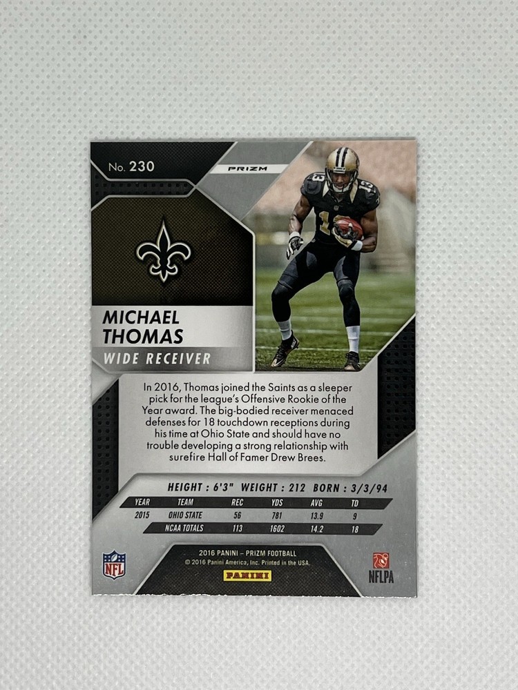 Elevate your collection with the 2016 Panini Prizm Rookie Silver Prizm #230 featuring the talented wide receiver Michael Thomas. As a cherished addition from Michael Thomas's rookie year, this card captures the early promise of a career that has since taken flight. The Silver Prizm variety is known for its eye-catching shimmer, making it a standout piece. This card comes ungraded, presenting an opportunity for collectors to have it professionally assessed. With its pristine surface and meticulous storage since its initial acquisition, it boasts a clean and crisp appearance, ready to be the centerpiece of any collection. Whether you're a die-hard Saints fan or a connoisseur of sports memorabilia, this Michael Thomas rookie card is a gem worth considering.