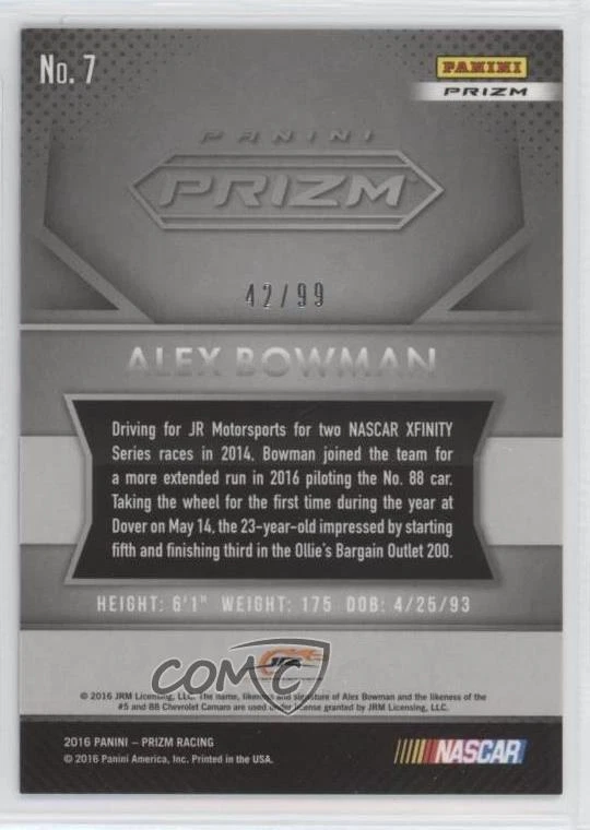 2016 Panini Prizm NASCAR - [Base] - Blue Flag Prizm #7 Alex Bowman Qty Made: 99 - Racing Card - Featuring the Tommy Baldwin Racing - Featuring Alex Bowman Search for more: 2016 Panini Prizm NASCAR Search for more: 2016 Panini Prizm NASCAR - [Base] - Blue Flag Prizm View all of our Listings Auctions Buy It Now About Us Located in the beautiful Pacific Northwest, COMC (Check Out My Cards) is the world's largest consignment service for trading card singles. More than 10,000 people have used our consignment service to list over 50 million trading cards. We currently house 20 million cards, each listed for sale with front and back images of the actual card. Find out how we can help you consign your items on eBay by contacting us through eBay messaging. COMC -- "The Safe & Easy Way to Buy & Sell" Representative Image - Select Specific Item above to see image of actual item Representative Image - Select Specific Item above to see image of actual item Raw Condition for Modern Cards Unless otherwise noted, raw modern cards are listed in Near Mint-Mint condition or better. A NM-MT card appears to be Mint at first glance, but upon closer inspection, may exhibit some of the following: minor print defects (e.g. roller marks, print line, dimple), minor scratches, slight edge wear, and slight corner wear. Centering is clearly visible in the images provided and does not factor into our condition assessment. Raw Condition for Vintage Cards Unless otherwise noted, raw vintage cards are listed in Excellent condition or better. An EX card may exhibit some of the following: minor rounding of corners, surface wear, print defects, light scratches, and slight edge wear/chipping. Centering is clearly visible in the images provided and does not factor into our condition assessment. Domestic Shipping Combined shipping for multiple items is available. To receive combined shipping, please ensure all desired items are in your eBay shopping cart before proceeding to checkout. eBay limits orders to 40 items per order. We automatically combine multiple orders placed on the same day. If you place multiple orders on the same day, please contact us to request a refund of applicable shipping costs. Signature confirmation may be required on invoices over $400. Raw cards are shipped in toploaders. International Shipping COMC offers eBay's International Shipping (EIS) for international orders under $2,500* (see country exceptions below). All duties and import fees are paid at checkout; in the rare event that there are additional import fees upon delivery, these are borne by the buyer. EIS packages route through a shipping hub in Erlanger, KY before shipping to their final destination. Please note that EIS does not allow for combined shipments. The shipping rates are determined by eBay and cannot be adjusted. *Maximum sale price exceptions: Colombia, Kuwait ($2,000); Taiwan ($1,539); Chile, Costa Rica, Guatemala, Honduras, Trinidad and Tobago ($1,000); Antigua and Barbuda, Aruba, Belize, Dominica, Grenada, Philippines, Saint Kitts and Nevis, Saint Lucia, Montserrat, Turks and Caicos Islands ($500); Dominican Republic, El Salvador ($200). Please request a shipping quote through eBay messaging for orders that exceed the maximum sale price supported by eBay's International Shipping. You will be responsible for all duties and import fees for international orders shipped outside the EIS. Raw cards are shipped in toploaders. Payment COMC does not accept offers on our cards through our eBay storefront. COMC utilizes eBay’s managed payments system. If you are experiencing difficulties making a payment, please contact eBay for assistance. Return Policy Returns are only accepted on the rare occasion the item is not as described. If you are making a return, please initiate the return process through eBay so a mailing label can be provided for you. Prior to listing, our expert team carefully assessed this item to represent it accurately. Please review the description and high-definition images prior to purchasing to ensure this item meets your satisfaction. We welcome you to contact us if you have further questions about this item. Trust and Integrity COMC carefully assesses each item consigned to us to prevent fraudulent items from entering the marketplace. If you believe an item offered on COMC may be fraudulent, please contact us with details so we can investigate the issue. Items we determine are outside our supported items policy may be removed. Last Modified: 10/14/2024 10:04:35 PM PDT