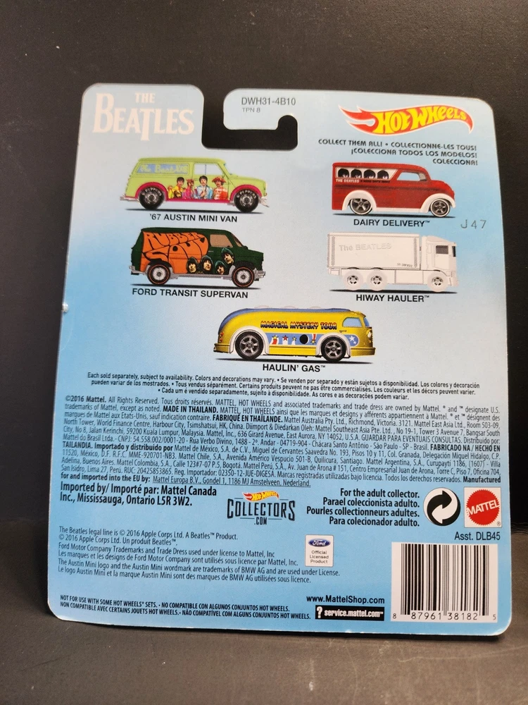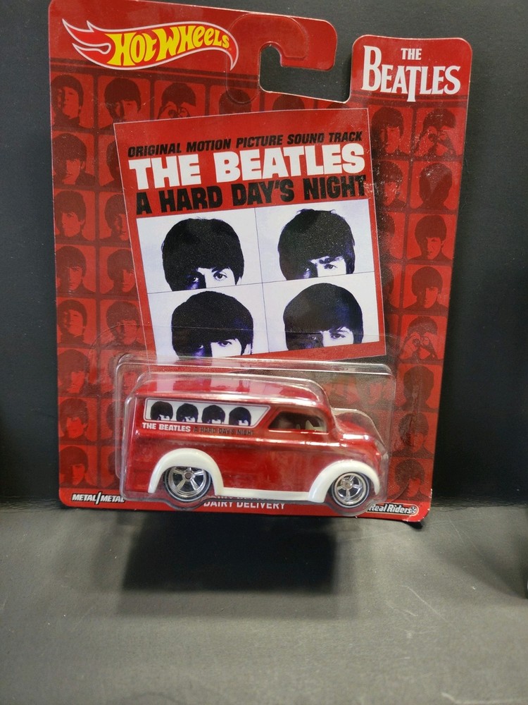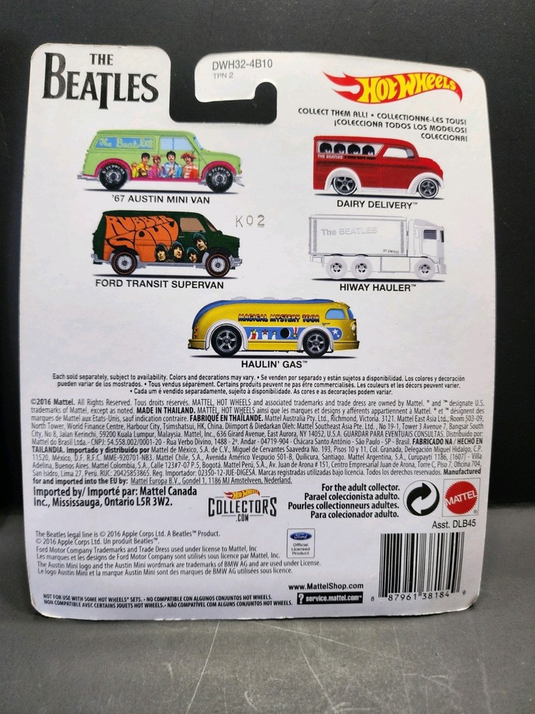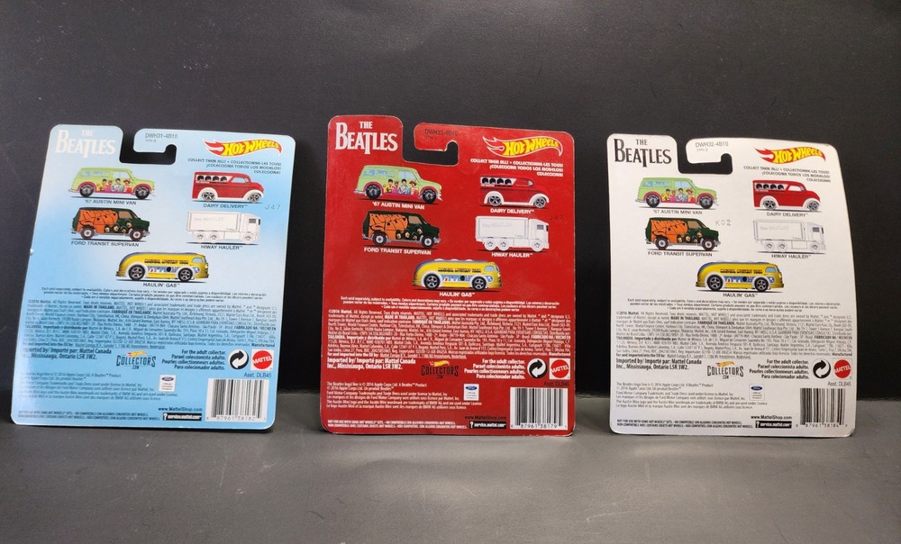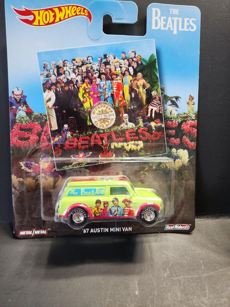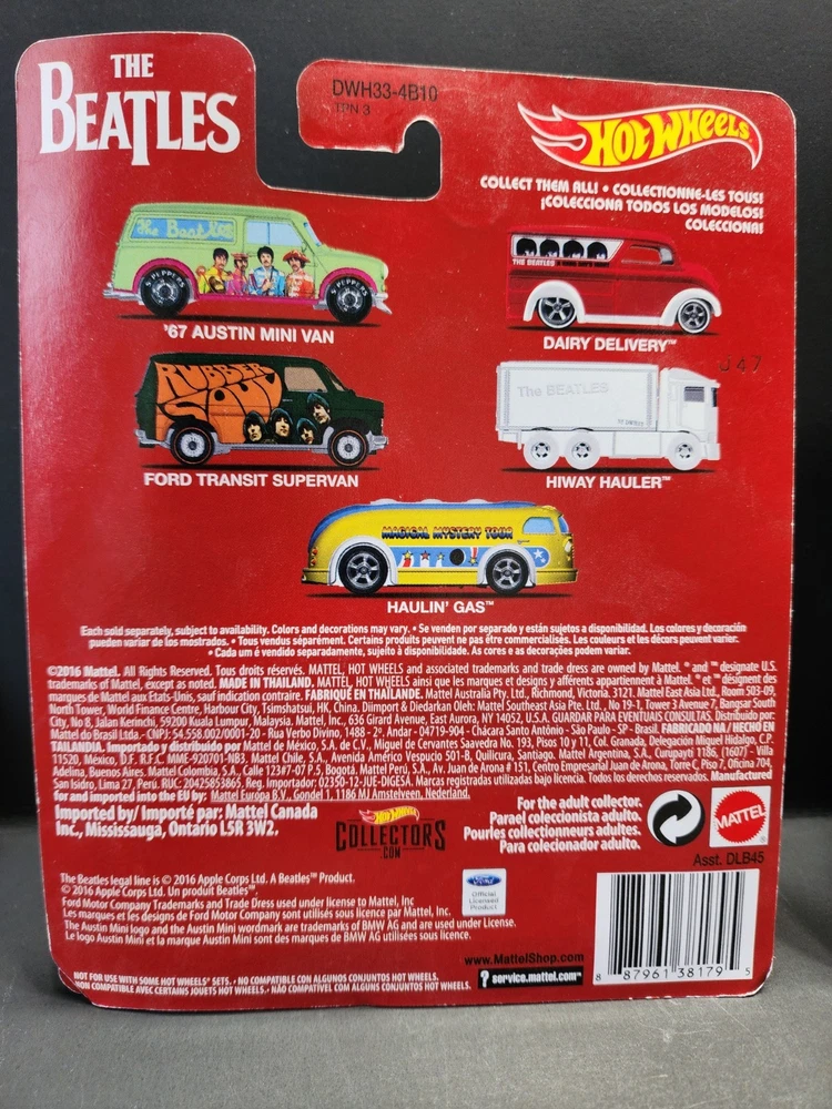 This 3 piece 2016 'The Beatles' Hotwheel lot is a unique and collectible item for any music memorabilia enthusiast. Featuring the iconic band The Beatles, known for their influential role in the music industry and their classic rock & pop genre, this lot offers a nostalgic and nostalgic piece of music history. The set likely includes various Hotwheels cars or vehicles featuring images or references to the beloved British band, making it a must-have for fans of The Beatles and collectors of music memorabilia. Includes, new in original packaging: '67 Austin Mini Van Dairy Delivery Hiway Hauler