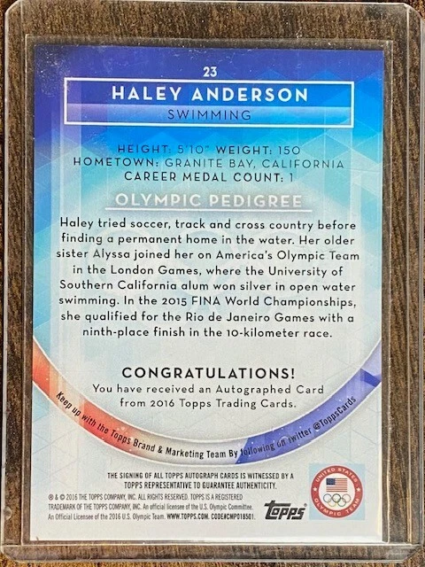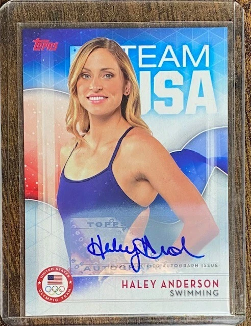 The product is a 2016 Topps U.S. Olympic & Paralympic Team and Hopefuls trading card featuring athlete Haley Anderson. This autographed rookie card is serial-numbered and belongs to a single-parallel set, making it a unique addition to any sports trading card collection. As a member of Team USA, Haley Anderson's autographed rookie card holds value for collectors interested in Olympic memorabilia.