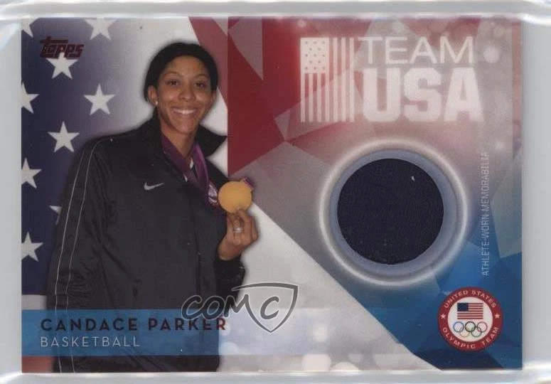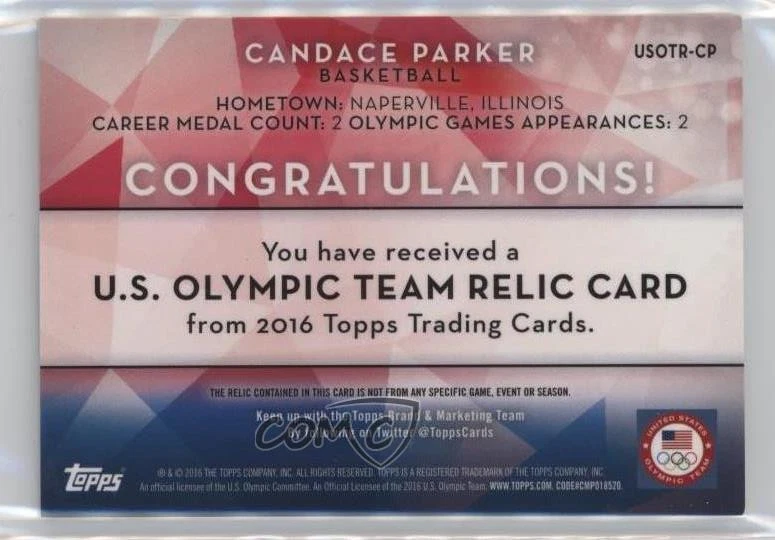 The product is a 2016 Topps trading card featuring WNBA player Candace Parker as part of the U.S. Olympic & Paralympic Team and Hopefuls set. This memorabilia card includes a piece of material worn by Candace Parker during an Olympic event, making it a unique collectible for fans of both the WNBA and the Olympics. The card is numbered USOTR-CP and showcases Parker's affiliation with Team USA in the 2016 Olympic season, adding value to any sports trading card collection.