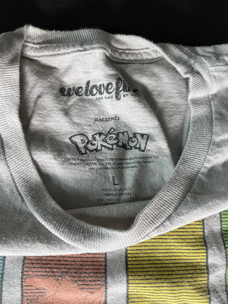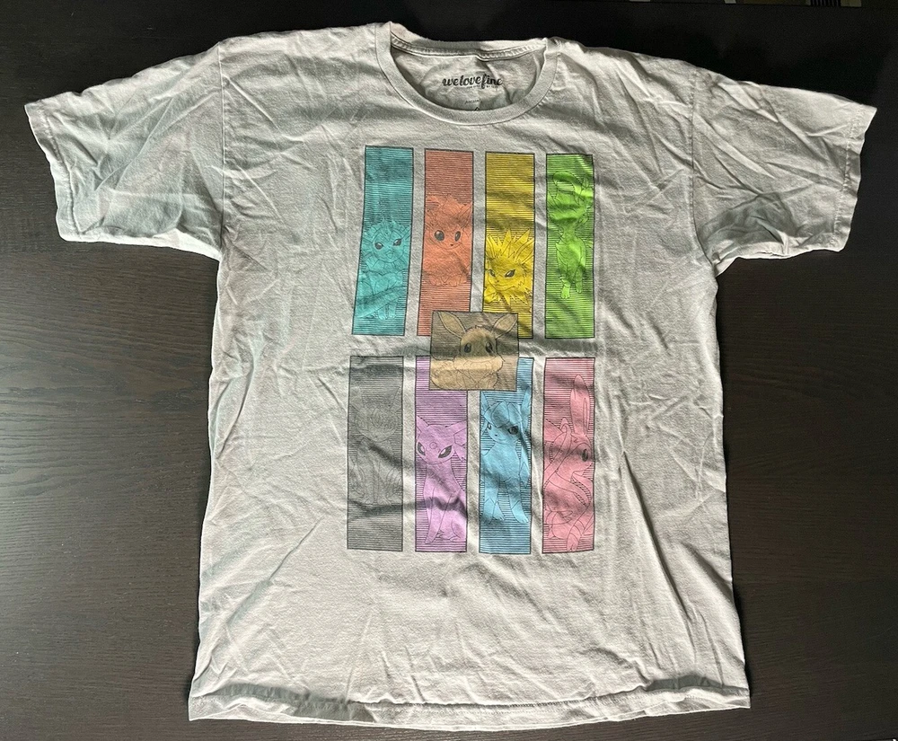 This 2016 We Love Fine Pokemon Eeveelutions 9 Panel Graphic T Shirt Men's Large L measures approximately 20” across chest and 28” long.