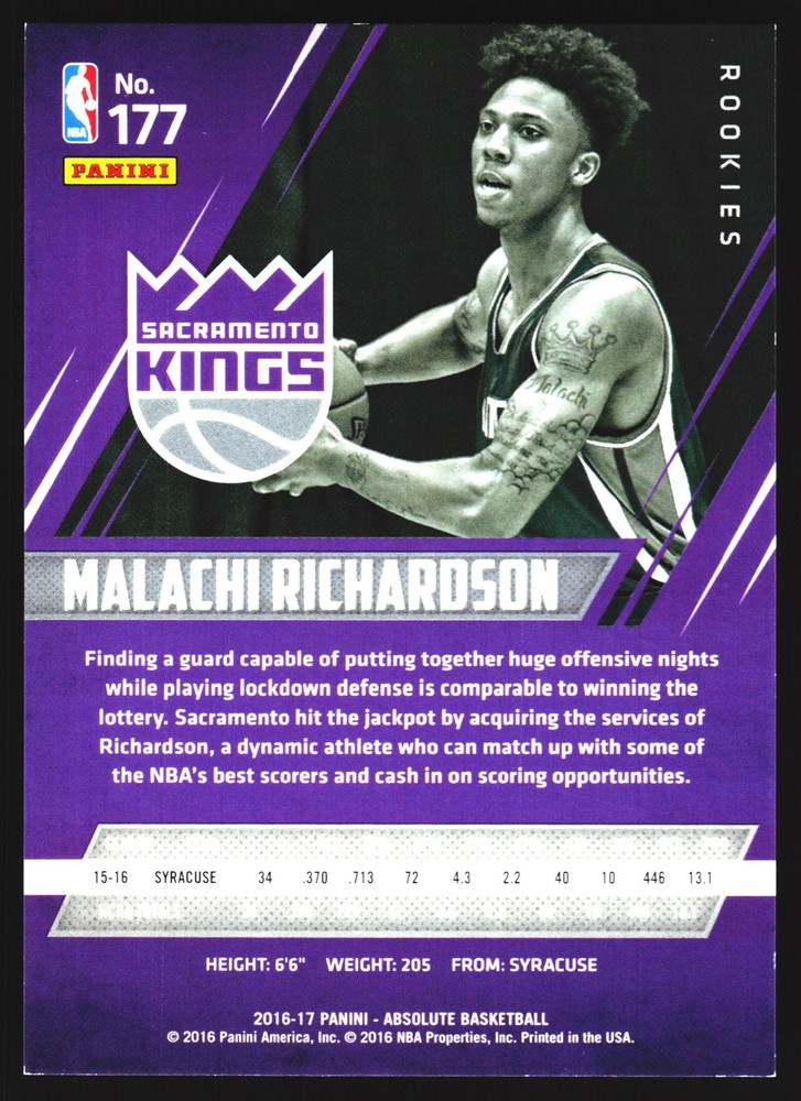 You will receive a Near Mint or Better, Malachi Richardson, 2016-17 Panini Absolute, , Sacramento Kings card PLEASE NOTE: SOME CARDS THAT GO THROUGH OUR SCANNER MAY APPEAR TO HAVE LINES THROUGH THEM. THEY ARE NOT ACTUAL SCRATCHES, SIMPLY FALSE IMAGE LINES. WE WILL NOT INTENTIALLY SELL, DAMAGED CARDS. NEW CARDS LISTED DAILY ORDERS SHIP NEXT DA Y (Weekends as mail service is available) VISIT OUR STORE FOR MORE DEALS! USE THE SEARCH ICON IN THE STORE TO FIND YOUR FAVORITE TEAMS & PLAYERS! Be sure to save us as sellers to be the first to be notified when new and exciting cards are posted! Please note, we are not professional graders, and the condition of the card you purchased is highly subjective. Please refer to the high quality scans of the card you are viewing, and determine the condition of the card for yourself. Feel free to reach out with questions! All cards are in EX-NM+ condition, unless stated otherwise Chrome cards from various brands might have minor light surface scratches, which is typical with these type of cards. Any major, deep scratches or major surface issues will be noted, if present. We take pride in the condition of all of our cards, including commons. Our promise to you, is that we will not sell a card we would not buy ourselves. Of course things slip by, however customer service is our #1 Priority, and we are always here for a message for ANY, and ALL issues. Thank you very much for stopping by, feel free to reach out! - Titan (Son) & Andy (Dad)