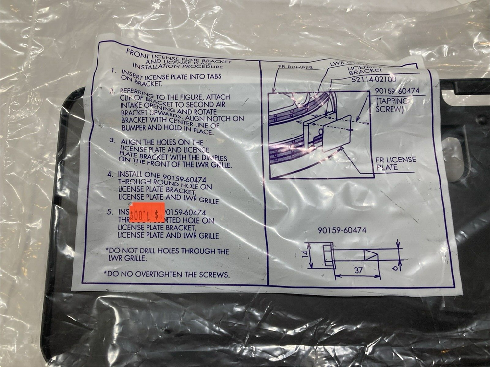 OE/OEM Part Number:52114-02100Performance Part:NoPlacement on Vehicle:FrontAttachment Type:Screw-OnBrand:ToyotaFitment Type:Direct ReplacementType:Front License Plate BracketCountry/Region of Manufacture:UnknownManufacturer Part Number:52114-02100gtin13:Does not applyFinish:BlackFeatures:Easy InstallationUniversal Fitment:NoInterchange Part Number:52114-02100UPC:Does not applyManufacturer Warranty:No WarrantyItems Included:ScrewsOE Spec or Performance/Custom:OE SpecMaterial:PlasticColor:BlackVintage Part:No