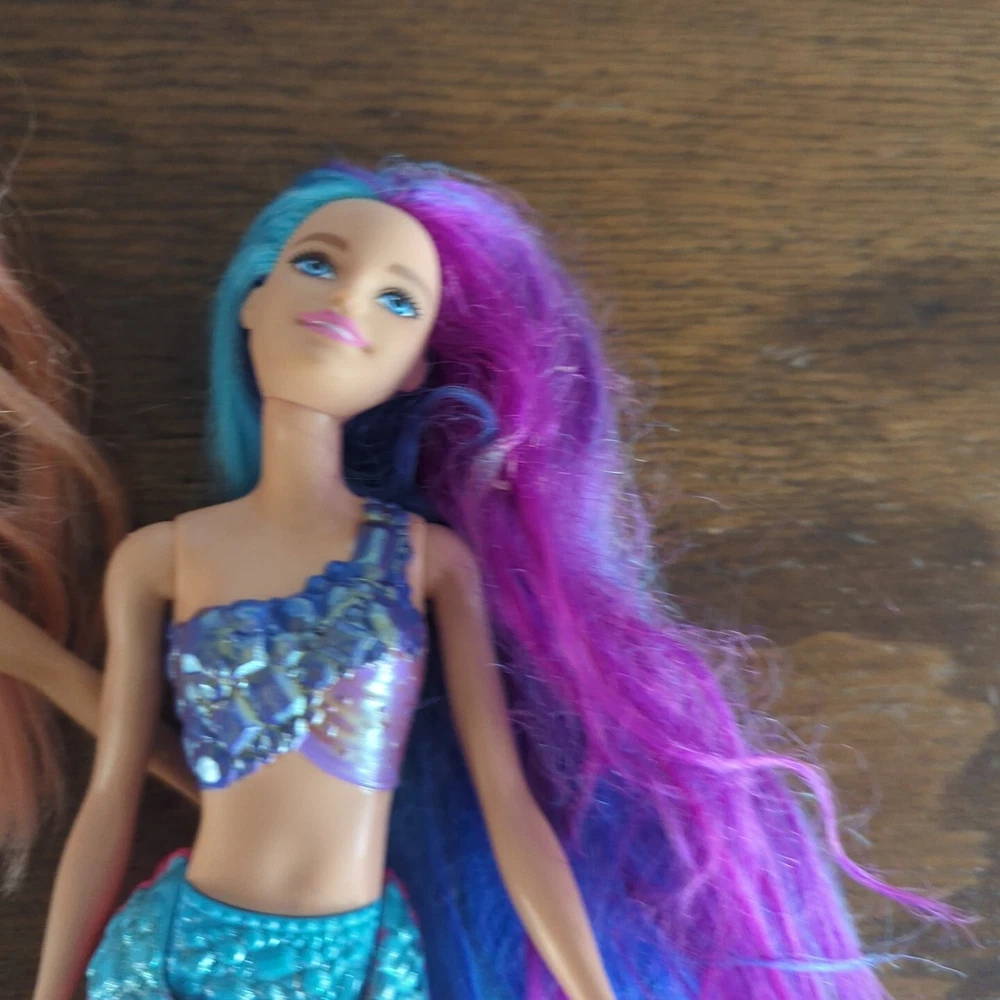 This is a lot of mermaid Barbie dolls. One has lights that do work. One has hair that needs some work. Has glue? Stuck in it