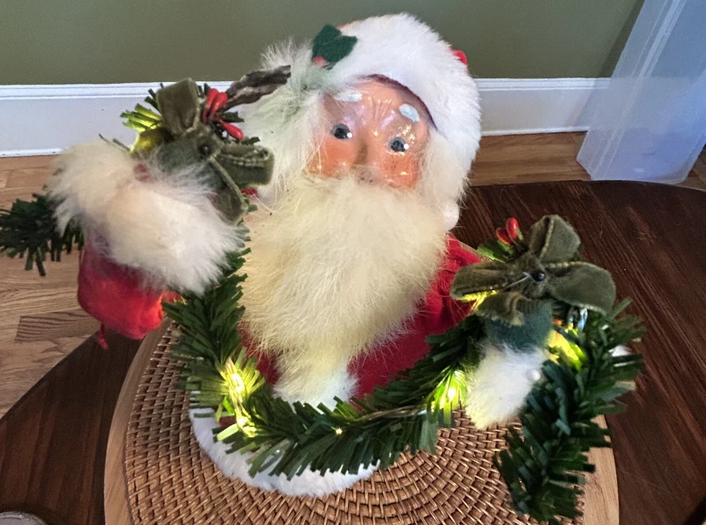 This product is a handmade 2017 Byers Choice LTD Santa Claus figurine made of mixed materials. The Santa is dressed in red velvet and holds "Lighted Greens". It is a Christmas-themed collectible item that was manufactured in the United States.