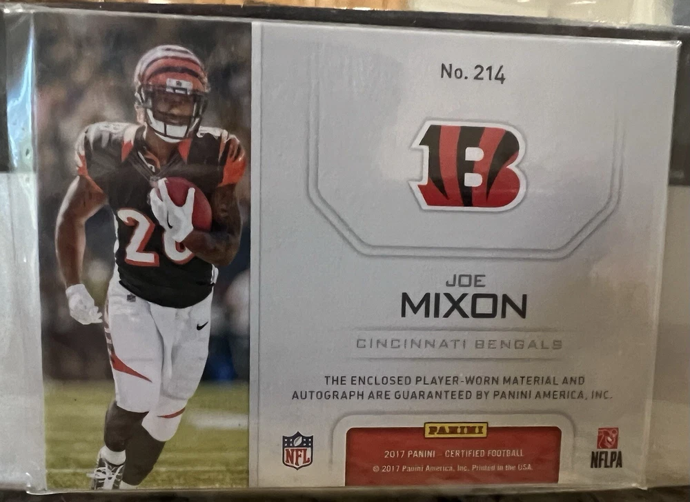 Type: Sports Trading Card Features: Serial Numbered, Parallel/Variety, Rookie, Memorabilia, Short Print Card Number: 214 Autograph Authentication: Panini Authentic Season: 2017 Print Run: 349 Parallel/Variety: Mirror Orange Player/Athlete: Joe Mixon Signed By: Joe Mixon Autograph Format: Label or Sticker League: National Football League (NFL) Team: Cincinnati Bengals Autographed: Yes Set: 2017 Panini Certified Sport: Football Year Manufactured: 2017 Manufacturer: Panini