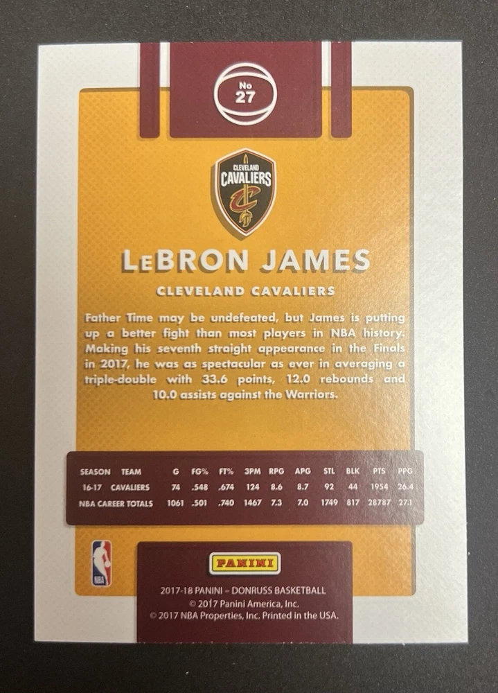 Vintage: No Type: Sports Trading Card Player/Athlete: LeBron James Set: Donruss Sport: Basketball Year Manufactured: 2017 Team: Cleveland Cavaliers Manufacturer: Donruss Autographed: No Season: 2017 Card Number: 27 League: NBA