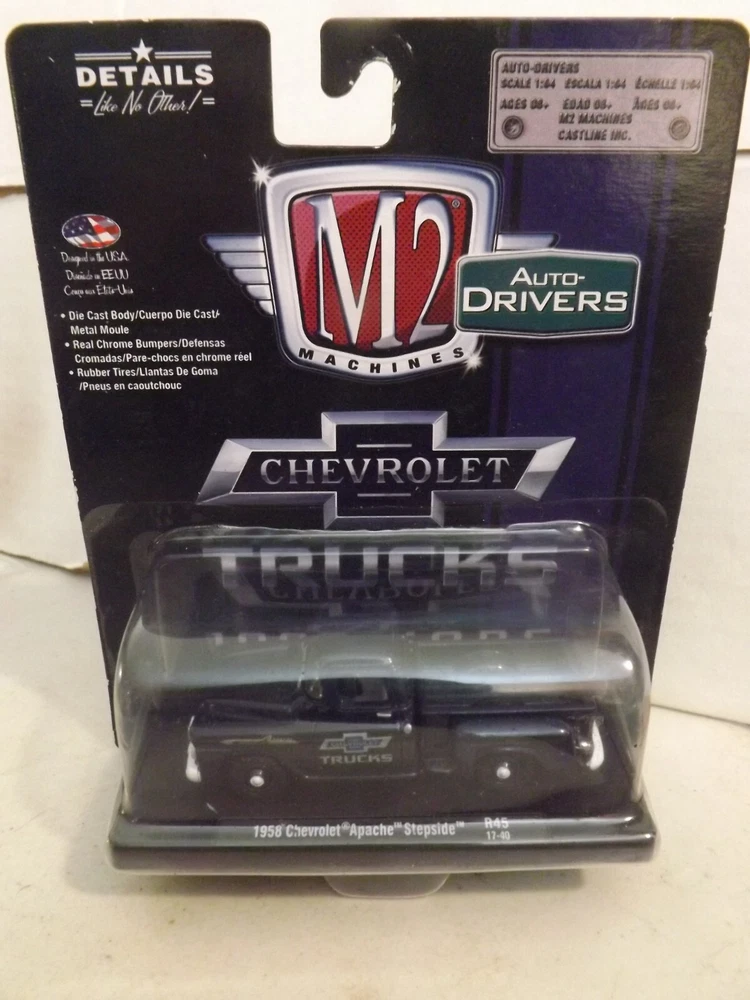 This auction is for a 2017 M2, Auto-Drivers, Chevrolet, Purple, 1958 Chevrolet Apache Stepside, R45, 17-40 , 1/64 Scale , Car is mint card has a little wear , Winning bidder pays $5.50 for Shipping and Handling with Delivery Confirmation in the U.S.A. Will combine shipping. ,
