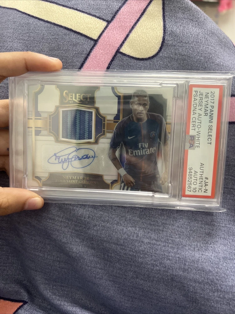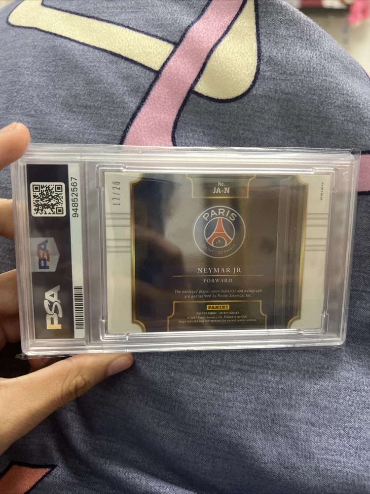 This 2017 Panini Select trading card features Neymar Jr. autographed with a jersey parallel/variety. The card is part of the 2017 Panini Select set and has a card number of 12/20. It is a La Liga, FIFA World Cup, and French Ligue 1 soccer card. The card is in English and manufactured by Panini. It is a great addition to any soccer fan's collection and is a must-have for Neymar Jr. fans. The card is in PSA10 and is a rare find. Get your hands on this amazing card now!