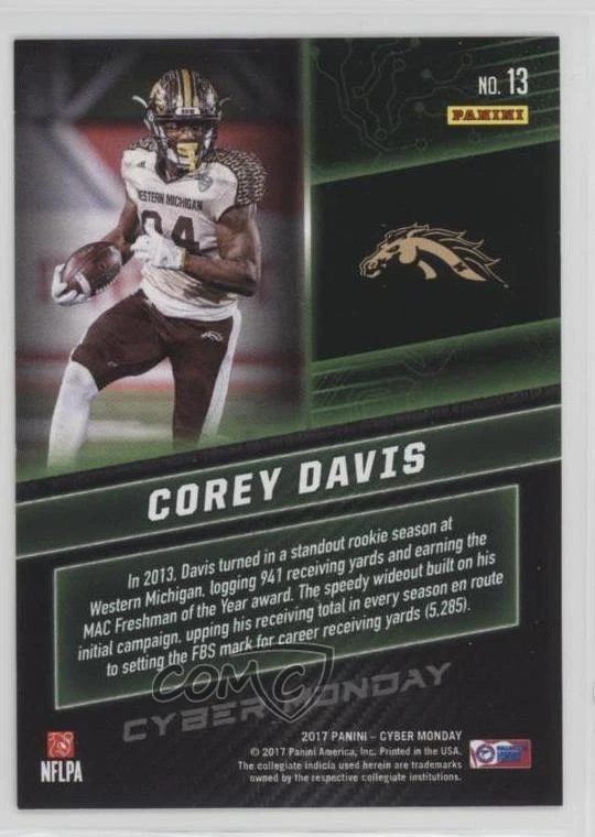 2017 Panini Cyber Monday - [Base] #13 Corey Davis - Rookie - MultiSport Card - Featuring the Western Michigan Broncos - Featuring Corey Davis Search for more: 2017 Panini Cyber Monday Search for more: 2017 Panini Cyber Monday - [Base] View all of our Listings Auctions Buy It Now About Us Located in the beautiful Pacific Northwest, COMC (Check Out My Cards) is the world's largest consignment service for trading card singles. More than 10,000 people have used our consignment service to list over 50 million trading cards. We currently house 20 million cards, each listed for sale with front and back images of the actual card. Find out how we can help you consign your items on eBay by contacting us through eBay messaging. COMC -- "The Safe & Easy Way to Buy & Sell" Representative Image - Select Specific Item above to see image of actual item Representative Image - Select Specific Item above to see image of actual item Raw Condition for Modern Cards Unless otherwise noted, raw modern cards are listed in Near Mint-Mint condition or better. A NM-MT card appears to be Mint at first glance, but upon closer inspection, may exhibit some of the following: minor print defects (e.g. roller marks, print line, dimple), minor scratches, slight edge wear, and slight corner wear. Centering is clearly visible in the images provided and does not factor into our condition assessment. Raw Condition for Vintage Cards Unless otherwise noted, raw vintage cards are listed in Excellent condition or better. An EX card may exhibit some of the following: minor rounding of corners, surface wear, print defects, light scratches, and slight edge wear/chipping. Centering is clearly visible in the images provided and does not factor into our condition assessment. Domestic Shipping Combined shipping for multiple items is available. To receive combined shipping, please ensure all desired items are in your eBay shopping cart before proceeding to checkout. eBay limits orders to 40 items per order. We automatically combine multiple orders placed on the same day. If you place multiple orders on the same day, please contact us to request a refund of applicable shipping costs. Signature confirmation may be required on invoices over $400. Raw cards are shipped in toploaders. International Shipping COMC offers eBay's International Shipping (EIS) for international orders under $2,500* (see country exceptions below). All duties and import fees are paid at checkout; in the rare event that there are additional import fees upon delivery, these are borne by the buyer. EIS packages route through a shipping hub in Erlanger, KY before shipping to their final destination. Please note that EIS does not allow for combined shipments. The shipping rates are determined by eBay and cannot be adjusted. *Maximum sale price exceptions: Colombia, Kuwait ($2,000); Taiwan ($1,539); Chile, Costa Rica, Guatemala, Honduras, Trinidad and Tobago ($1,000); Antigua and Barbuda, Aruba, Belize, Dominica, Grenada, Philippines, Saint Kitts and Nevis, Saint Lucia, Montserrat, Turks and Caicos Islands ($500); Dominican Republic, El Salvador ($200). Please request a shipping quote through eBay messaging for orders that exceed the maximum sale price supported by eBay's International Shipping. You will be responsible for all duties and import fees for international orders shipped outside the EIS. Raw cards are shipped in toploaders. Payment COMC does not accept offers on our cards through our eBay storefront. COMC utilizes eBay’s managed payments system. If you are experiencing difficulties making a payment, please contact eBay for assistance. Return Policy Returns are only accepted on the rare occasion the item is not as described. If you are making a return, please initiate the return process through eBay so a mailing label can be provided for you. Prior to listing, our expert team carefully assessed this item to represent it accurately. Please review the description and high-definition images prior to purchasing to ensure this item meets your satisfaction. We welcome you to contact us if you have further questions about this item. Trust and Integrity COMC carefully assesses each item consigned to us to prevent fraudulent items from entering the marketplace. If you believe an item offered on COMC may be fraudulent, please contact us with details so we can investigate the issue. Items we determine are outside our supported items policy may be removed. Last Modified: 12/31/2024 8:48:34 AM PDT