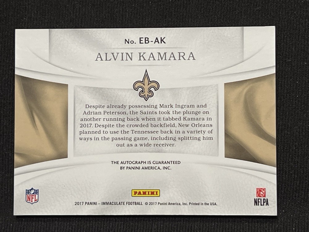 Immerse yourself in the excitement of the NFL with this 2017 Panini Immaculate Collection Alvin Kamara rookie card. Featuring the coveted Eye Black Gold Auto variety, this card is a standout piece with a limited print run of just 10, making it a rare treasure for collectors and fans alike. Embellished with the iconic New Orleans Saints colors and Kamara's distinctive signature, the card is serial numbered to ensure its authenticity. This Panini gem from the Immaculate Rookie Eye Black insert set captures the essence of the sport and elevates any collection to new heights.
