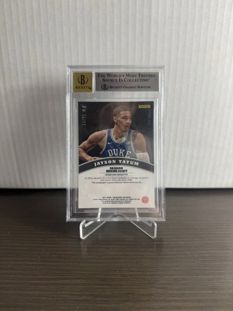 Own a piece of basketball history with this 2017 Panini National Convention VIP Jayson Tatum Autographed Rookie Card. This limited edition card is serial numbered and features the Boston Celtics star in his NBA Finals uniform. The card is part of the Autograph Escher Squares parallel/variety and is authenticated by Panini Authentic. In addition to being a great addition to any sports trading card collection, this card also has a high Beckett grade of 8.5. The card is an original and comes with a label or sticker autograph format. Don't miss out on the chance to own this rare and valuable piece of memorabilia.