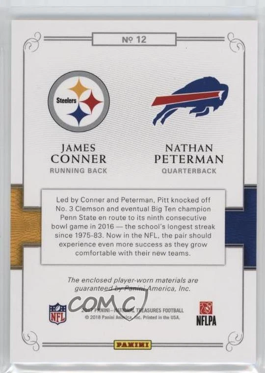 2017 Panini National Treasures - Rookie NFL Combo Materials #12 James Conner, Nathan Peterman Qty Made: 99 - Rookie - Football Card - Featuring the Pittsburgh Steelers and Buffalo Bills - Featuring James Conner and Nathan Peterman Search for more: 2017 Panini National Treasures Search for more: 2017 Panini National Treasures - Rookie NFL Combo Materials View all of our Listings Auctions Buy It Now About Us Located in the beautiful Pacific Northwest, COMC (Check Out My Cards) is the world's largest consignment service for trading card singles. More than 10,000 people have used our consignment service to list over 50 million trading cards. We currently house 20 million cards, each listed for sale with front and back images of the actual card. Find out how we can help you consign your items on eBay by contacting us through eBay messaging. COMC -- "The Safe & Easy Way to Buy & Sell" Representative Image - Select Specific Item above to see image of actual item Representative Image - Select Specific Item above to see image of actual item Raw Condition for Modern Cards Unless otherwise noted, raw modern cards are listed in Near Mint-Mint condition or better. A NM-MT card appears to be Mint at first glance, but upon closer inspection, may exhibit some of the following: minor print defects (e.g. roller marks, print line, dimple), minor scratches, slight edge wear, and slight corner wear. Centering is clearly visible in the images provided and does not factor into our condition assessment. Raw Condition for Vintage Cards Unless otherwise noted, raw vintage cards are listed in Excellent condition or better. An EX card may exhibit some of the following: minor rounding of corners, surface wear, print defects, light scratches, and slight edge wear/chipping. Centering is clearly visible in the images provided and does not factor into our condition assessment. Domestic Shipping Combined shipping for multiple items is available. To receive combined shipping, please ensure all desired items are in your eBay shopping cart before proceeding to checkout. eBay limits orders to 40 items per order. We automatically combine multiple orders placed on the same day. If you place multiple orders on the same day, please contact us to request a refund of applicable shipping costs. Signature confirmation may be required on invoices over $400. Raw cards are shipped in toploaders. International Shipping COMC offers eBay's International Shipping (EIS) for international orders under $2,500* (see country exceptions below). All duties and import fees are paid at checkout; in the rare event that there are additional import fees upon delivery, these are borne by the buyer. EIS packages route through a shipping hub in Erlanger, KY before shipping to their final destination. Please note that EIS does not allow for combined shipments. The shipping rates are determined by eBay and cannot be adjusted. *Maximum sale price exceptions: Colombia, Kuwait ($2,000); Taiwan ($1,539); Chile, Costa Rica, Guatemala, Honduras, Trinidad and Tobago ($1,000); Antigua and Barbuda, Aruba, Belize, Dominica, Grenada, Philippines, Saint Kitts and Nevis, Saint Lucia, Montserrat, Turks and Caicos Islands ($500); Dominican Republic, El Salvador ($200). Please request a shipping quote through eBay messaging for orders that exceed the maximum sale price supported by eBay's International Shipping. You will be responsible for all duties and import fees for international orders shipped outside the EIS. Raw cards are shipped in toploaders. Payment COMC does not accept offers on our cards through our eBay storefront. COMC utilizes eBay’s managed payments system. If you are experiencing difficulties making a payment, please contact eBay for assistance. Return Policy Returns are only accepted on the rare occasion the item is not as described. If you are making a return, please initiate the return process through eBay so a mailing label can be provided for you. Prior to listing, our expert team carefully assessed this item to represent it accurately. Please review the description and high-definition images prior to purchasing to ensure this item meets your satisfaction. We welcome you to contact us if you have further questions about this item. Trust and Integrity COMC carefully assesses each item consigned to us to prevent fraudulent items from entering the marketplace. If you believe an item offered on COMC may be fraudulent, please contact us with details so we can investigate the issue. Items we determine are outside our supported items policy may be removed. Last Modified: 12/15/2024 12:35:21 AM PDT