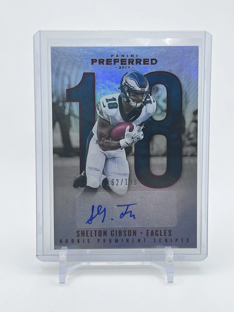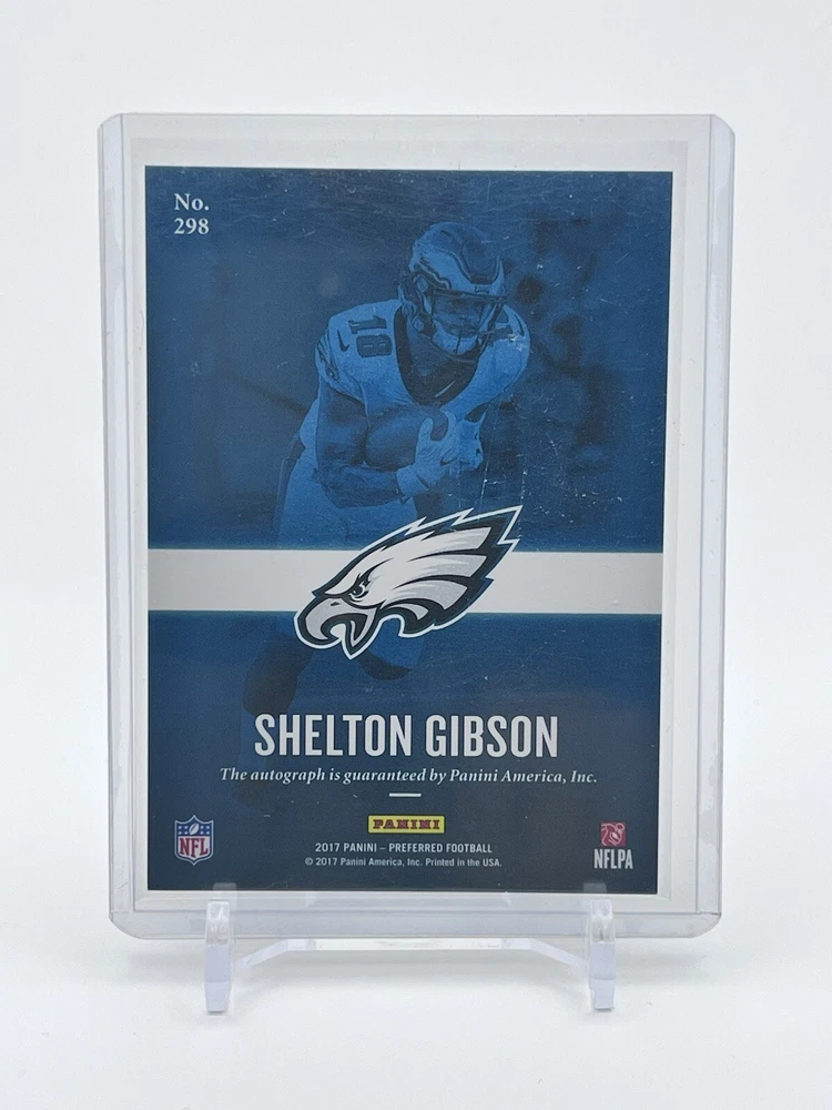 Elevate your football card collection with the 2017 Panini Preferred #298 featuring rookie wide receiver Shelton Gibson. This striking card is highlighted by Gibson's autograph, authenticated by Panini Authentic, and sits atop a limited print run of just 199. The red parallel variety makes it a distinctive piece for enthusiasts and collectors alike. A treasure for fans of the Philadelphia Eagles or collectors seeking a piece from the 2017 NFL season, this card captures the essence of the sport. It is a genuine original issue from the United States, ungraded to maintain its raw appeal, and serial numbered to signify its exclusivity. Own a snapshot of a promising athlete's rookie season with this collectible card.
