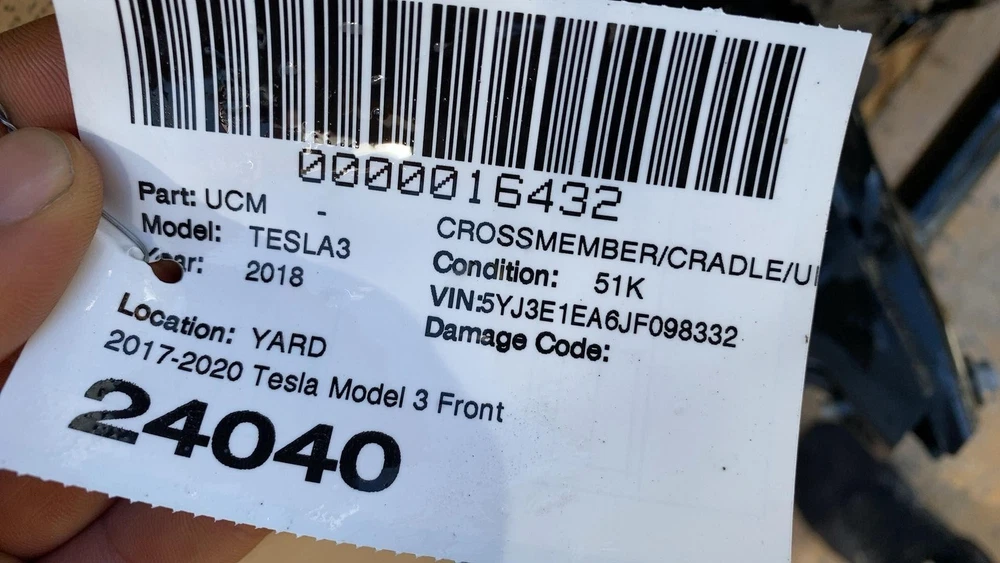 Donut Auto Dismantling Donut Auto Dismantling Rancho Cordova, CA Business Hours (PST/PDT) Mon - Fri 8am - 5pm Closed Sat & Sun CROSSMEMBER/CRADLE/UNDERCARRIA Year: 18 Model: TESLA MODEL 3 Side: Type: U Category: U Condition: 51K Vehicle Stock #: 24040 Part Stock #: 0000016432 Additional notes: 2017-2020 Tesla Model 3 Front Chassis Subframe w/ Ankle Catcher Crush Can Assy Interchange: Also fits: Search for more parts from this donor vehicle Search for more parts for TESLA MODEL 3 Dear Valued Customers Examine all photos and read the description. Please contact us and ask any questions you have about the item. What you see in the pictures is what you will receive. Item are sold as Pictured in our ads, All the damages are marked in pictures with colored markings ........ indicated scratches, O indicate dents/dings view all photos and description. All Parts come with a 30-Day warranty Compatibility We are not responsible for compatibility, please order parts with the same part number to avoid delays and fitment issues in your purchase. Always verify O.E.M part numbers check fitment. Shipping & Return Policy For LTL and freight shipments of large items like Battery Packs, Seats, Doors, Trunks, Hoods, and other sizable body parts, a commercial address is mandatory . This must be a business equipped with a dock or forklift. Please note that deliveries cannot be made to restaurants, office buildings, or hotels. Please allow 5-11 business days from the shipping date to receive freight items. If a forklift is not available to unload your package, please ensure that you added liftgate service fee to your order. Residential deliveries have an extra charge required by LTL to cover liftgate usage and city ordinance. Be advised not all LTL freight companies offer lift gate services in every town especially in rural areas. If you do not have a commercial address or a proper residential address reach out to us to work things out LTL items can always be held at your local hub and made available for pickup. We offer free local pickup Monday through Friday, from 8:00 AM to 5:00 PM. What separates us from our competitors As Pioneers in the Tesla used parts market Donut Auto Parts is leading in the industry. We have been specializing in Tesla's for over 5 years. Our Staff are highly trained and experienced Tesla specialists. We strive to help you solve all your part needs. Local Customers For our local customers we provide installation on battery packs and drive units purchase. Drive unit and battery pack installations come with a 60 day warranty . All parts are fully tested. Using the industries leading tools, we also provide installation of other parts. Please reach out to us directly for more information. Be Advised Programming may be required for most electronic components. Donut Auto Parts is not responsible for any labor costs and other charges such as programming. NO RESTOCKING FEE Payment Payment must be submitted within 48 hours after purchase time. We have a Same handling time when paid by 2pm pst and 3-day handling time for LTL freight items. Feedback and Rating We always Strive to earn positive feedback. If you encounter an issue with one of our items, please contact us before leaving any feedback or opening a case give us the opportunity to solve your order issue. We strive to provide excellent customer service to ensure that everyone is satisfied, and to gain happy and returning customers! ALLOW US TO RESOLVE ISSUES BEFORE LEAVING YOUR FEEDBACK PLEASE CONTACT US FIRST Airbag Notification If the item above is an airbag, I certify this airbag is not subject to recall and will be shipped in accordance with hazmat shipping requirements . Powered by Checkmate