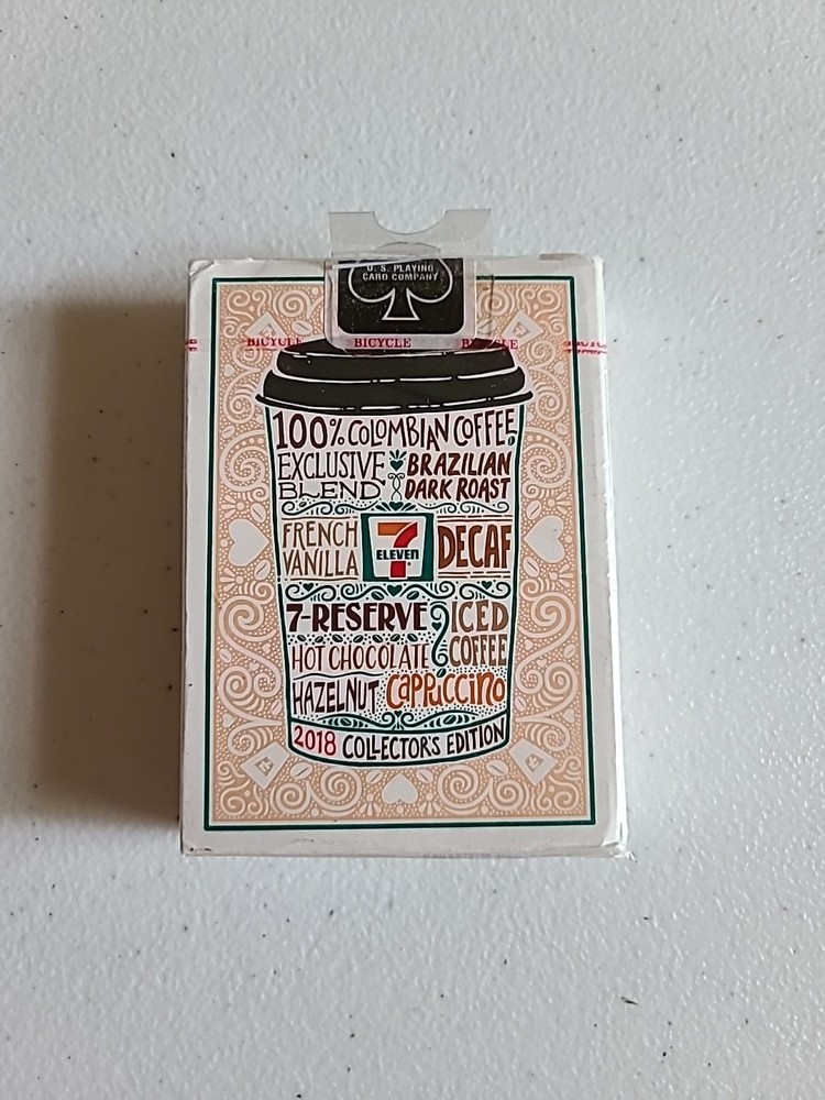 The Bicycle 7-Eleven 7-11 2018 Coffee Collector's Edition Playing Cards are a unique and limited edition set of playing cards featuring a special design in honor of 7-Eleven stores. Branded by Bicycle, known for producing high-quality playing cards, this collector's edition set is a must-have for any card enthusiast or collector. With a sleek and functional design, these cards are perfect for playing games or displaying as a special addition to any card collection.