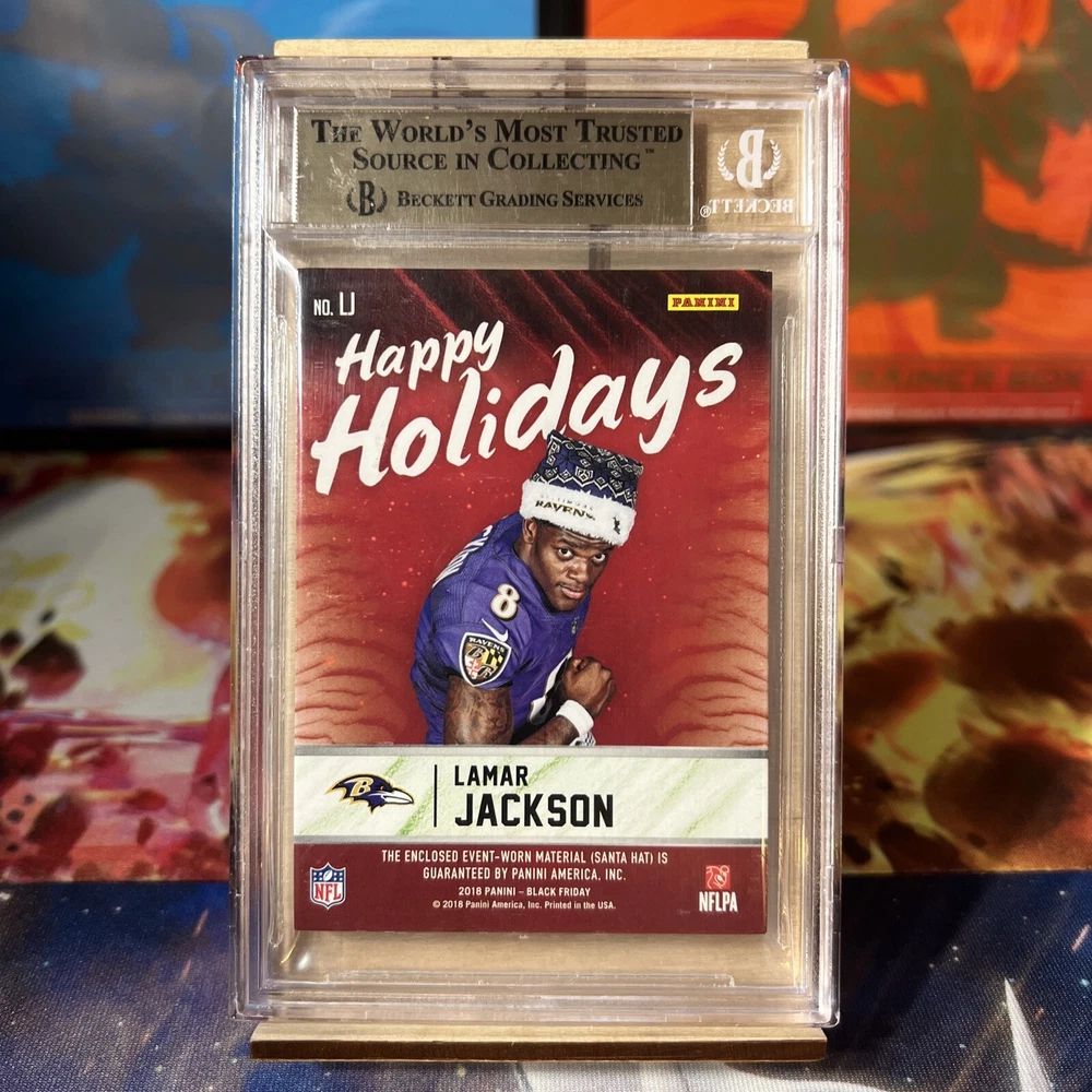 This 2018 Panini Black Friday trading card features Lamar Jackson of the Baltimore Ravens. The card is a Cracked Ice parallel variety, with a print run of 5, and is serial numbered for added authenticity. This card is a great addition to any football fan's collection, especially those who are fans of the National Football League (NFL). The card is a rookie card and also features memorabilia from the player. It has been graded by Beckett and received a score of 9.5, making it a valuable addition to any sports trading card collection. This card is perfect for those who are looking for a unique and rare card to add to their collection.