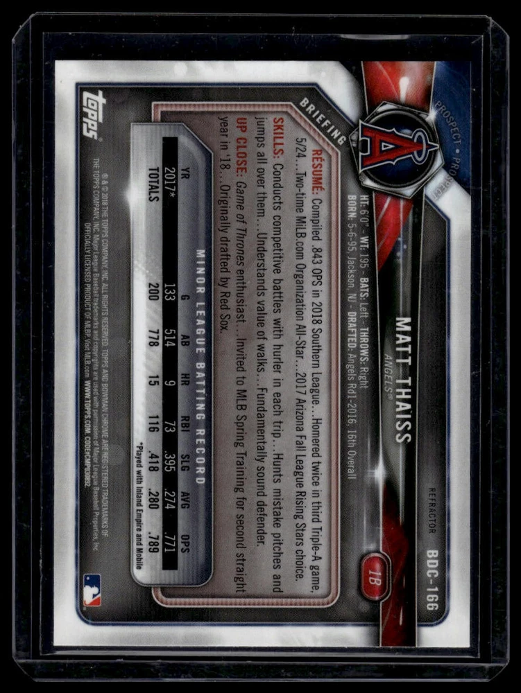 This is a nice example of a 2018 Bowman Draft #BDC-166 Matt Thaiss Chrome Refractors.Other important information about this card: In 2018 Matt Thaiss played for the Los Angeles Angels.Please check out our other listings for more great cards. Shipping can be combined! First card is $1.25 - each additional card is $0.50. Up to 2 cards will be toploaded, additional cards won/paid for will be in a penny sleeve. Larger combined orders - max shipping rate will be $6.00 Thank you for your business!