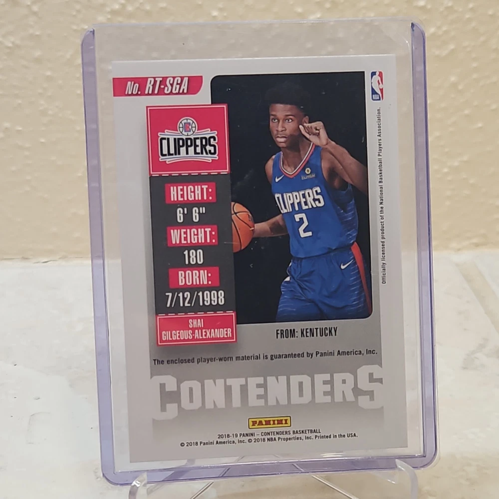 This 2018 Panini Contenders digital card features Shai Gilgeous-Alexander, a rookie player from the Los Angeles Clippers. The card showcases a rookie ticket patch and is graded as near mint or better. It is a great addition to any NBA fan's collection, especially those who love digital cards. The card is unautographed and comes from the National Basketball Association (NBA) league. It is a sports trading card that is perfect for collectors who enjoy basketball. The card number is RT-SGA and it was manufactured by Panini in 2018. This card is a must-have for any fan of Shai Gilgeous-Alexander or the Los Angeles Clippers.