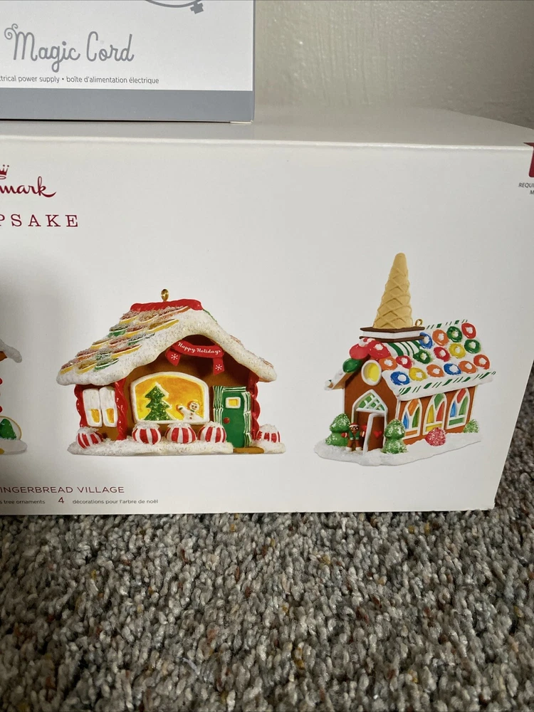 2018 Hallmark Gingerbread Village. Set of 4 gingerbread houses. New in box in original packing, never displayed. Magic cord included. Connect ornaments to magic cord to see a continuous light effect. In excellent condition. Payment due in 3 days. No international shipping.