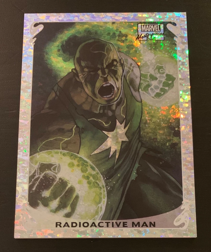 2018 MARVEL MASTERPIECES # 3 RADIOACTIVE MAN /99 SPECKLE HOLOFOIL INSERT CARD. BOX HIT FOIL CARD IS IN NEAR MINT CONDITION OR BETTER. ALL MY ITEMS COME FROM A SMOKE-FREE HOUSE. SHIPMENT WILL BE SENT IN 2 DAYS OF PAYMENT. I WILL SHIP THIS CARD IN THE GREATEST OF CARE. BUYERS OUTSIDE OF THE CONTINENTAL U.S. MAY HAVE TO PAY EXTRA FOR SHIPPING. I DO OFFER COMBINE SHIPPING RATES. SO PLEASE CHECK OUT MY OTHER ITEMS . FEEL FREE TO MESSAGE ME WITH ANY QUESTIONS. THANKS FOR LOOKING AND GOOD LUCK.