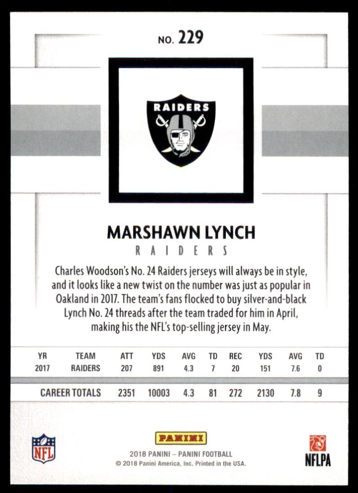 2018 Panini #229 Marshawn Lynch Front Back Sport: Football Set: 2018 Panini Year: 2018 Item#: 229 Player: Marshawn Lynch Team: Oakland Raiders Brand: Panini Manufacturer: Panini Group Grading Company: Raw Grade SetType: Main Item Condition: Near Mint/Mint 2014 Beckett Collectibles, LLC. All Rights Reserved Powered by: Thank you for choosing Burbank Sportscards, the sports cards superstore. We offer a large selection of singles across all sports. Visit our ebay store to view all our items available. Our Shipping Policy We offer Free Standard Shipping to all Domestic customers. Options for Expedited shipping are also available at checkout. For our international customers, shipping is $9.99 for the first item, and $0.25 for each additional item. Note to all customers: To qualify for combines shipping, we ask our customers to add items into the shopping cart. Please note, we do not combine orders that are placed separately. Our Service: Generally, our turnaround is super quick as we process and send out orders same day payment is received. Stock Availability: We do our best to ensure all items are in stock; however, in case of the rare stock out, the customer will have the option for a replacement card, or we will process a refund so the order is not held up. Our Images: Many of our images are stock photos from Beckett archives. They are a representation of the actual card you would receive. If you have any questions regarding the item you're interested in, please feel free to ask (serial numbers and relic pieces may vary) Moreover, in a case of a wrong or defective photo, please notify us, so we can adjust it. Other FAQ's: -When buying multiple cards, do you top load each item? No; however, we do try to insure all items are shipped securely. If you wish to have all of your cards top loaded it is a paid service and can be arranged. Please email for more details. For other questions, please feel free to ask. Thank you.