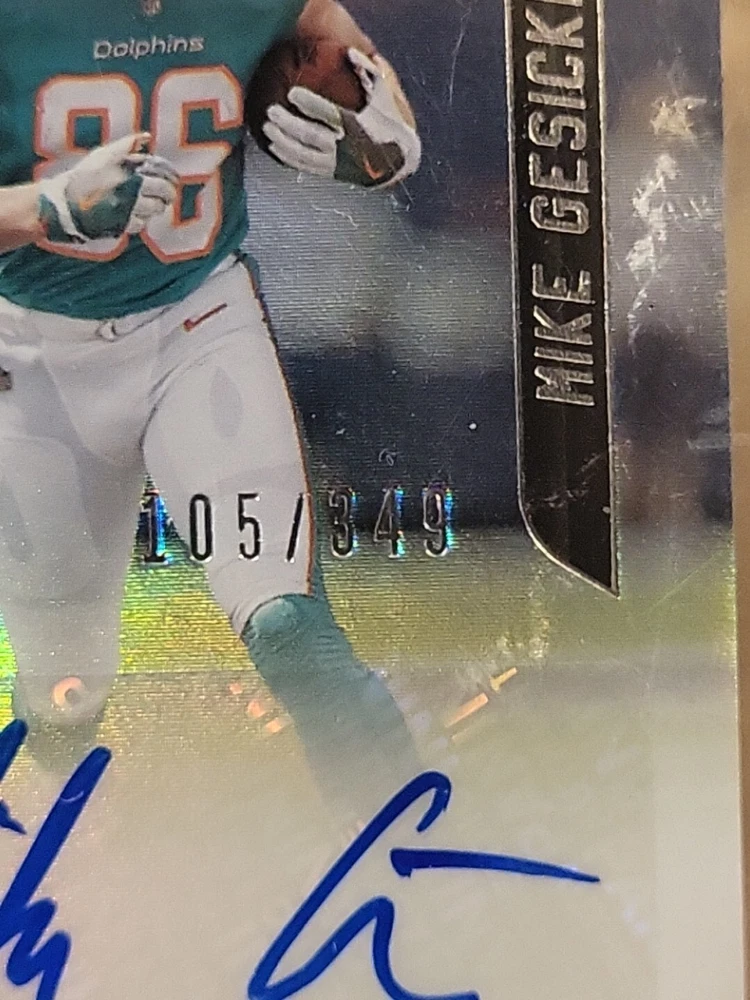 This 2018 Panini Certified sports trading card features Mike Gesicki of the Miami Dolphins. The card is a freshman fabric patch variation, autographed and serial numbered 105/349. It is a near mint or better condition type, ungraded, and manufactured by Panini. The card is a great addition for any National Football League (NFL) or football fan, and is part of the 2018 Panini Certified set. It also includes memorabilia and features a rookie designation. Get your hands on this unique item today!