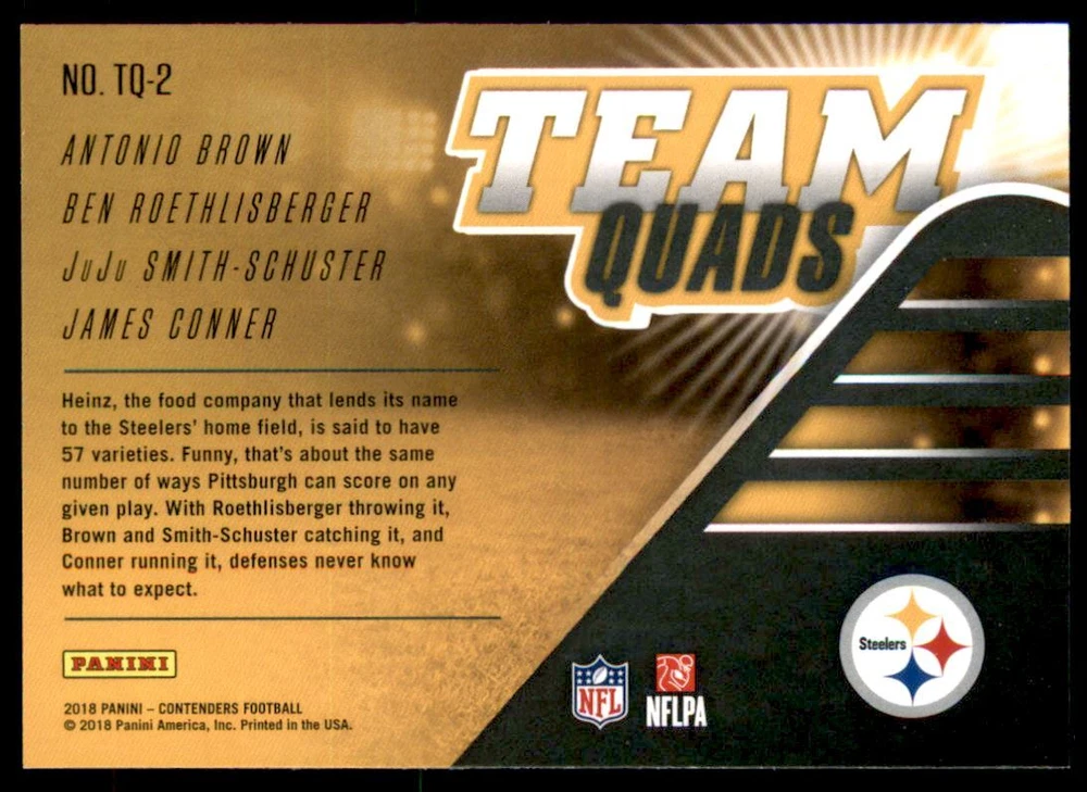 2018 Panini Contenders Team Quads #2 Roethlisberger Smith-Schuster Brown Conner Front Back Sport: Football Set: 2018 Panini Contenders Team Quads Year: 2018 Item#: 2 Player: Ben Roethlisberger, Antonio Brown, Juju Smith-Schuster, James Conner Team: Pittsburgh Steelers Brand: Panini Contenders Manufacturer: Panini Group Grading Company: Raw Grade SetType: Insert Item Condition: Near Mint/Mint 2014 Beckett Collectibles, LLC. All Rights Reserved Powered by: Thank you for choosing Burbank Sportscards, the sports cards superstore. We offer a large selection of singles across all sports. Visit our ebay store to view all our items available. Our Shipping Policy We offer Free Standard Shipping to all Domestic customers. Options for Expedited shipping are also available at checkout. For our international customers, shipping is $9.99 for the first item, and $0.25 for each additional item. Note to all customers: To qualify for combines shipping, we ask our customers to add items into the shopping cart. Please note, we do not combine orders that are placed separately. Our Service: Generally, our turnaround is super quick as we process and send out orders same day payment is received. Stock Availability: We do our best to ensure all items are in stock; however, in case of the rare stock out, the customer will have the option for a replacement card, or we will process a refund so the order is not held up. Our Images: Many of our images are stock photos from Beckett archives. They are a representation of the actual card you would receive. If you have any questions regarding the item you're interested in, please feel free to ask (serial numbers and relic pieces may vary) Moreover, in a case of a wrong or defective photo, please notify us, so we can adjust it. Other FAQ's: -When buying multiple cards, do you top load each item? No; however, we do try to insure all items are shipped securely. If you wish to have all of your cards top loaded it is a paid service and can be arranged. Please email for more details. For other questions, please feel free to ask. Thank you.