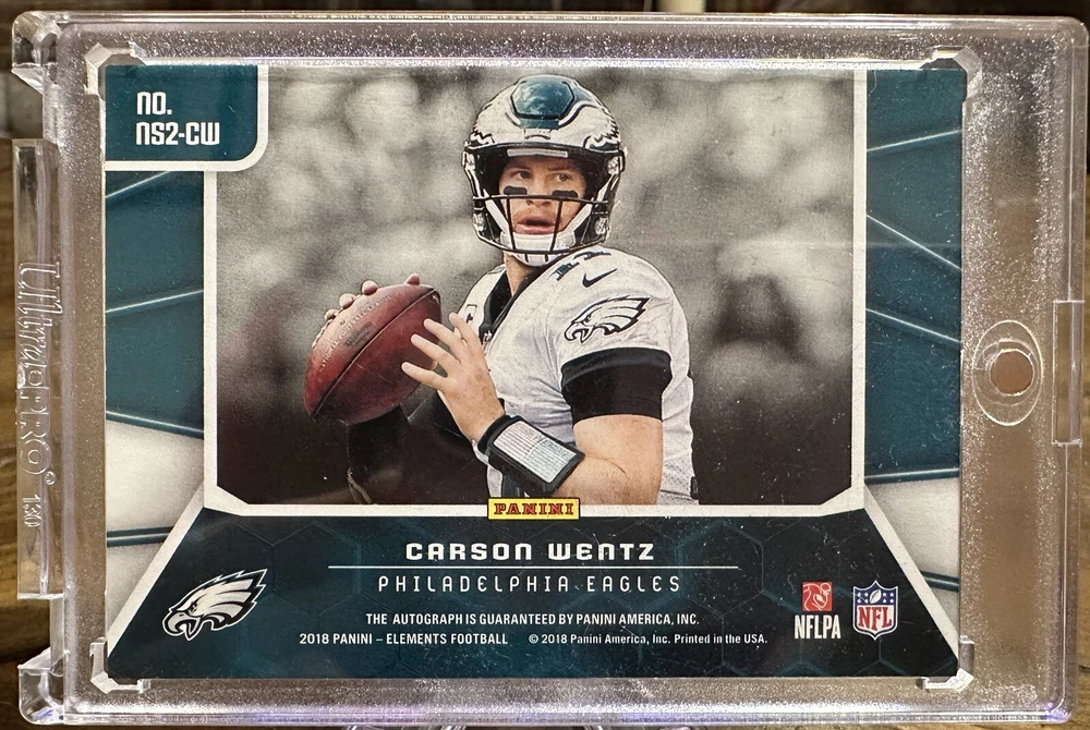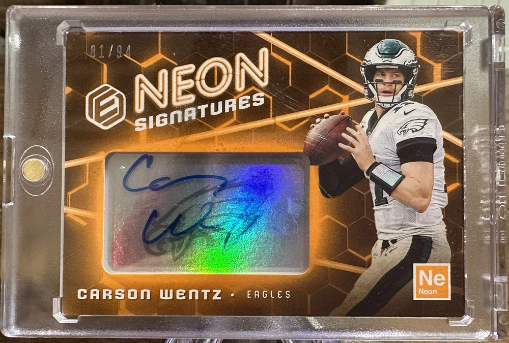 A 2018 Panini Neon Signatures trading card featuring Carson Wentz of the Philadelphia Eagles. This autographed card is numbered 81/94 and is in excellent condition. It is part of a set by Panini with a print run of 94 cards. The card is serial numbered with the card number NS2-CW.