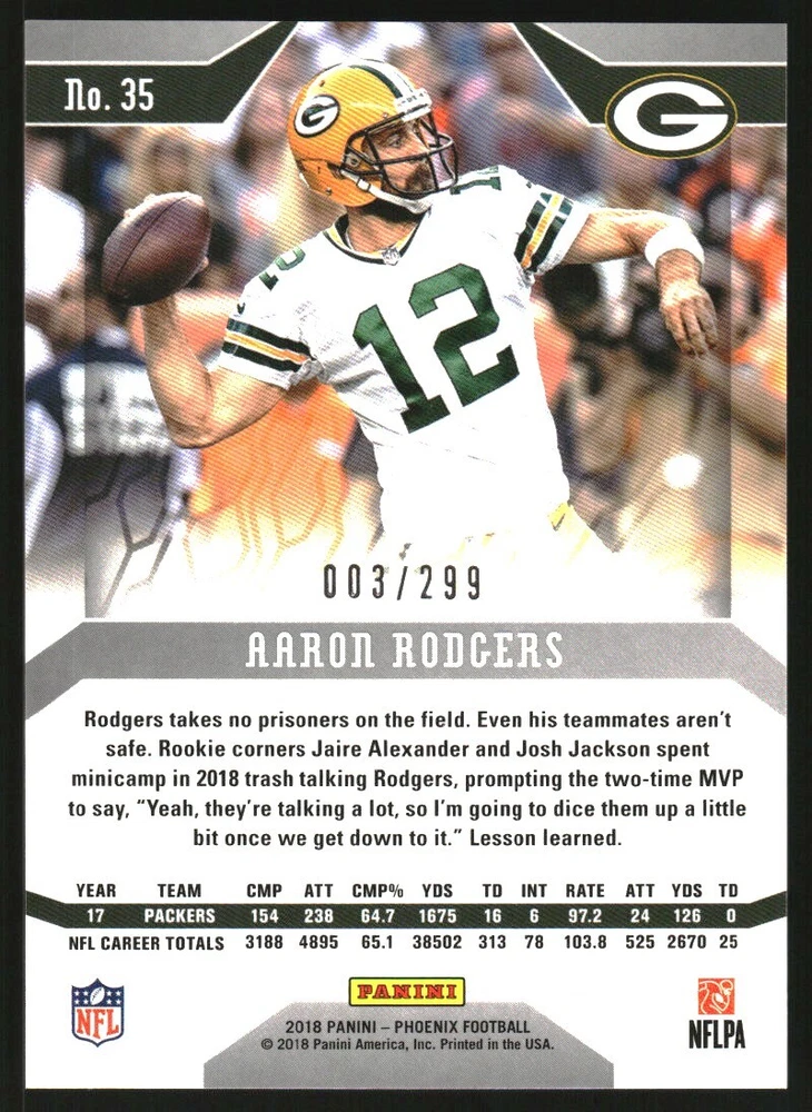 Sport: Football Team: Green Bay Packers Player: Aaron Rodgers Grade: Near Mint/Mint Item Attributes: Serial Numbered Original/Reprint: Original Graded: No Item Condition: Near Mint/Mint Year: 2018 Product: Single Card Manufacturer: Panini Group Period: Modern (1970-Now) Brand: Panini Phoenix