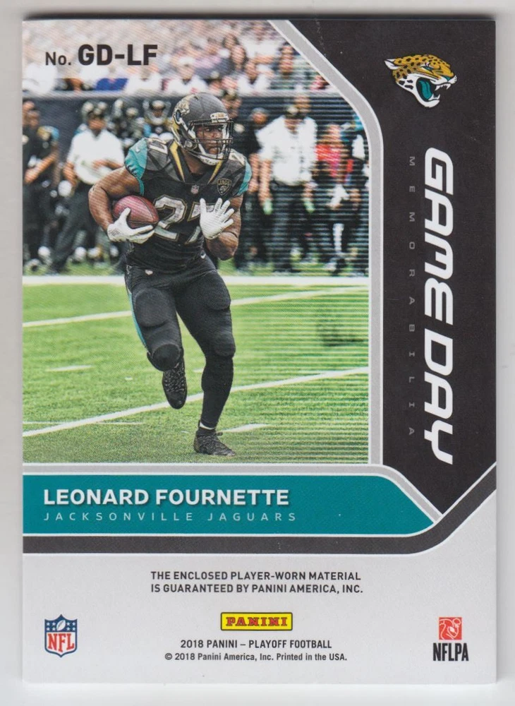 2018 Playoff Game Day Memorabilia Prime #10 Leonard Fournette Jersey /50 Front Back Sport: Football Set: 2018 Playoff Game Day Memorabilia Prime Year: 2018 Item#: 10 Player: Leonard Fournette Team: Jacksonville Jaguars Attributes: Memorabilia, Serial Numbered Brand: Playoff Manufacturer: Panini Group Grading Company: Raw Grade SetType: Parallel Insert Item Condition: Near Mint/Mint 2014 Beckett Collectibles, LLC. All Rights Reserved Powered by: Thank you for choosing Burbank Sportscards, the sports cards superstore. We offer a large selection of singles across all sports. Visit our ebay store to view all our items available. Our Shipping Policy We offer Free Standard Shipping to all Domestic customers. Options for Expedited shipping are also available at checkout. For our international customers, shipping is $9.99 for the first item, and $0.25 for each additional item. Note to all customers: To qualify for combines shipping, we ask our customers to add items into the shopping cart. Please note, we do not combine orders that are placed separately. Our Service: Generally, our turnaround is super quick as we process and send out orders same day payment is received. Stock Availability: We do our best to ensure all items are in stock; however, in case of the rare stock out, the customer will have the option for a replacement card, or we will process a refund so the order is not held up. Our Images: Many of our images are stock photos from Beckett archives. They are a representation of the actual card you would receive. If you have any questions regarding the item you're interested in, please feel free to ask (serial numbers and relic pieces may vary) Moreover, in a case of a wrong or defective photo, please notify us, so we can adjust it. Other FAQ's: -When buying multiple cards, do you top load each item? No; however, we do try to insure all items are shipped securely. If you wish to have all of your cards top loaded it is a paid service and can be arranged. Please email for more details. For other questions, please feel free to ask. Thank you.