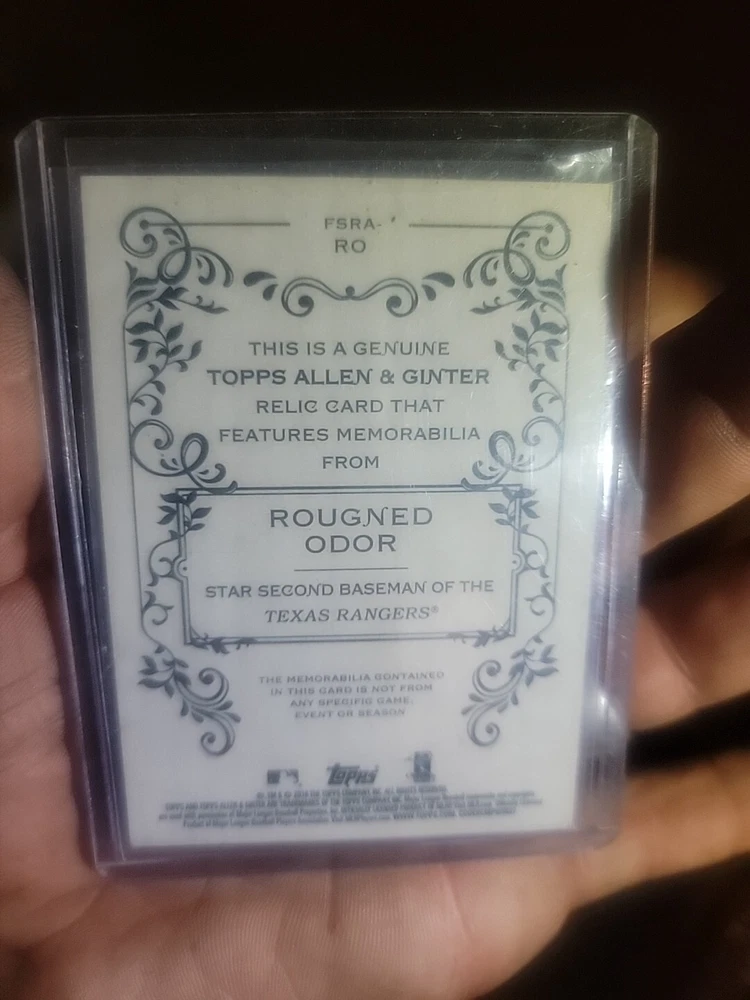 This 2018 Topps Allen & Ginter trading card features Rougned Odor of the Texas Rangers in a Major League Baseball (MLB) league setting. The card is near mint or better conditioned and ungraded. It is a relic card with a card number of FSRA-RO and is part of the 2018 Topps set. The card is an insert and also includes memorabilia from the player. It is a great addition to any baseball fan's collection. Get your hands on this unique sports trading card today!