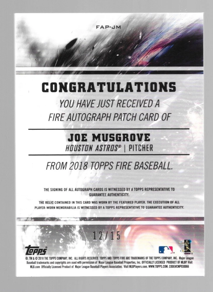 2018 Topps Fire Blue /15 Joe Musgrove #FAP-JM Patch Auto RC 3 Color See Scans