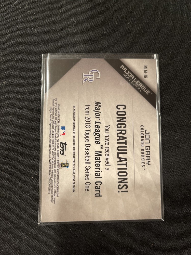 Set:2018 ToppsManufacturer:ToppsFeatures:Insert, Memorabilia, Serial Numbered, Parallel/VarietyCard Number:MLM-JGPlayer/Athlete:Jon GrayInsert Set:Major League Material Series 1Parallel/Variety:GoldType:Sports Trading CardLeague:Major League Baseball (MLB)Sport:BaseballTeam:Colorado RockiesSeason:2018Print Run:50