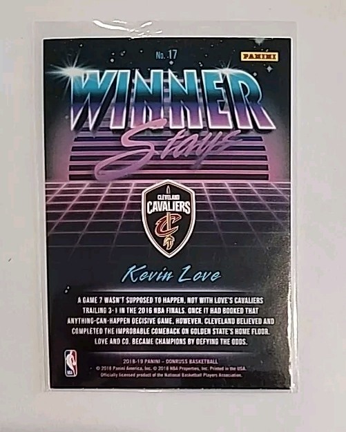 This sports trading card is a must-have for any basketball fan. Featuring Kevin Love of the Cleveland Cavaliers, this 2018-19 Donruss card is from the Winner Stays set and has a card number of 17. The card is perfect for collectors and fans alike, and is sure to be a prized possession for years to come.
