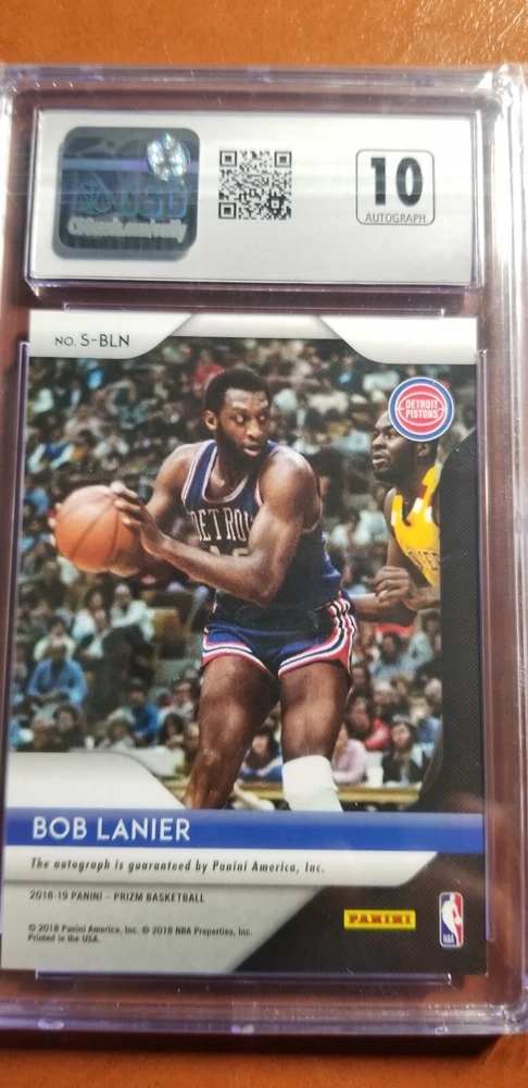 This 2018-19 Panini Prizm trading card showcases the autograph of basketball legend Bob Lanier, signed with a label or sticker format and authenticated by Panini Authentic. The card features Lanier in his Detroit Pistons uniform during his time in the National Basketball Association (NBA) and bears the card number S-BLN. This card is a must-have for any fan of the sport, especially those who collect sports trading cards. The card is in excellent condition with a CSG 8.5 NM/MINT+ rating and features a short print and signatures parallel/variety. Add this unique item to your collection today!