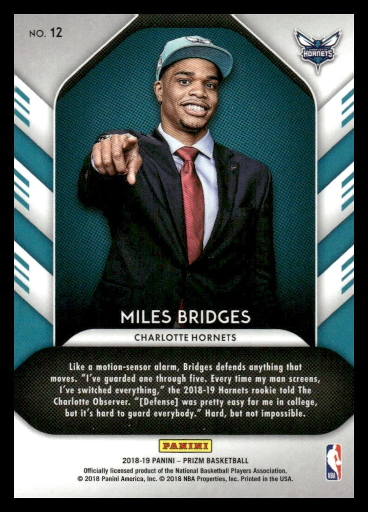 Set: 2018-19 Panini Prizm League: National Basketball Association (NBA) Card Number: 12 Series: Panini Prizm Sport: Basketball Season: 2018-19 Features: Rookie, Insert Team: Charlotte Hornets Player/Athlete: Miles Bridges Manufacturer: Panini brand: Panini Insert Set: Luck of the Lottery