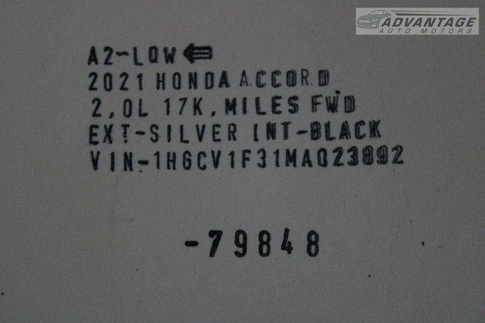 ADVANTAGE AUTO MOTORS DONOR VEHICLE: 2021 HONDA ACCORD SPORT ENGINE: 1 .5L I4 DOHC GAS (L15BE) TRANSMISSION: AUTOMATIC TRANSMISSION (CVT) DRIVE TYPE: FRONT WHEEL DRIVE (FWD) BODY TYPE: SEDAN 4-DOOR MILEAGE: 17K MILEAGE COLOR: EXTERIOR COLOR: LUNAR SILVER METALIC (NH-830M) INTERIOR COLOR/TRIM : BLACK / LEATHER (Z) VIN NUMBER: 1HGCV1F31MA023892 ATTENTION! PLEASE READ THE DESCRIPTION OF THE PRODUCT AND PLEASE READ OUR RULES BEFORE BUYING. MAKE SURE THE SPARE PARTS YOU WANT TO PURCHASE IS FIT FOR YOUR CAR. IF YOU ARE NOT SURE WHETHER THIS PART FITS YOUR CAR, CONTACT US OR CHECK THE INFORMATION WITH THE DEALER USING VIN NUMBER. YOU WILL RECEIVE EVERYTHING IS SPECIFIED IN THE DESCRIPTION AND IN THE PHOTOS. ALL SPARE PARTS ALREADY REMOVED FROM THE CAR AND ARE IN THE WAREHOUSE ON THE SHELVES. IF YOU BUY AN ITEM, IT WILL BE IMMEDIATELY PACKED AND SHIPPED. IF YOU NEED AN INVOICE FOR AN INSPECTION OR OTHER CHECK, YOU CAN CONTACT US ABOUT IT AND WE WILL SEND AN INVOICE TO YOUR E-MAIL. IF YOU HAVE ANY PROBLEMS: THE PRODUCT WILL NOT BE DELIVERED ON TIME OR WILL COME DAMAGED OR YOUR ORDER WILL BE LOST, DO NOT HURRY TO LEAVE NEGATIVE FEEDBACKS, PLEASE CONTACT US AND WE WILL SOLVE YOUR PROBLEM ASAP. IN THE LAST PHOTO ON THE TAG, WE INDICATE THE NUMBER OF SPARE PARTS FOR OUR EMPLOYEES, THAT IS IF IT SAYS QUANTITY: 4 ON THE TAG, IT MEANS WE HAVE 4 SUCH SPARE PARTS. TO GET 2 OR MORE PARTS, YOU MUST SELECT THE QUANTITY YOU WANT AT CHECKOUT. SHIPPING: FREE SHIPPING ONLY EXTENDED TO SMALL SPARE PARTS. DELIVERY FOR PARTS LIKE: ENGINE, TRANSMISSION, DOOR, HOOD, BUMPER, AND OTHER LARGE PARTS WILL BE SPECIFIED IN THE DESCRIPTION . INTERNATIONAL SHIPPING: DELIVERY COST TO ALASKA, HAWAI, PUERTO RICO AND GUAM $ 50 (SMALL SPARE PARTS). IF YOU WANT TO PURCHASE LARGE SPARE PARTS, PLEASE CONTACT US BEFORE YOU PURCHASE FOR SHIPPING COST. DELIVERY ABROAD IS ALSO POSSIBLE. CONTACT US TO FIND OUT THE PRICE AND TIME OF DELIVERY. EXPEDITE SHIPPING: IF YOU URGENTLY NEED SPARE PARTS, WE CAN SEND US USING OVERNIGHT OR 2 DAYS DELIVERY. CONTACT US AND WE WILL PROVIDE YOU WITH EXACT SHIPPING COST. RETURNS: WE HAVE A 30 DAY RETURN POLICY. BUYER PAYS RETURN SHIPPING IF REASON FOR RETURN: 1- ORDERED BY MISTAKE; 2- CHANGE MY MIND; 3- FIND THE BEST PRICE; 4- SPARE PARTS NOT FIT; 5- JUST DO NOT LIKE IT. IF THE BUYER HAS RETURNED THE PRODUCT AND THE PART NUMBERS DO NOT MATCH THE NUMBERS ON THE PHOTOS OR HAS RETURNED THE SPARE PARTS WITH DAMAGES OR THE BUYER OPENED THE PART, THEN ACCORDING eBay RULES, THE SELLER HAS THE RIGHT TO CHARGE 50% OF THE PRICE OF THE PRODUCT WARRANTY: WE HAVE 30 DAYS WARRANTY ON ENGINES, TRANSMISSIONS, TRANSFER CASES AND DIFFERENTIALS. NO LABOR COST REIMBURSEMENT. THANKS FOR YOUR INTEREST AND LOOKING FOR OUR DETAILS. AAM PARTS!!