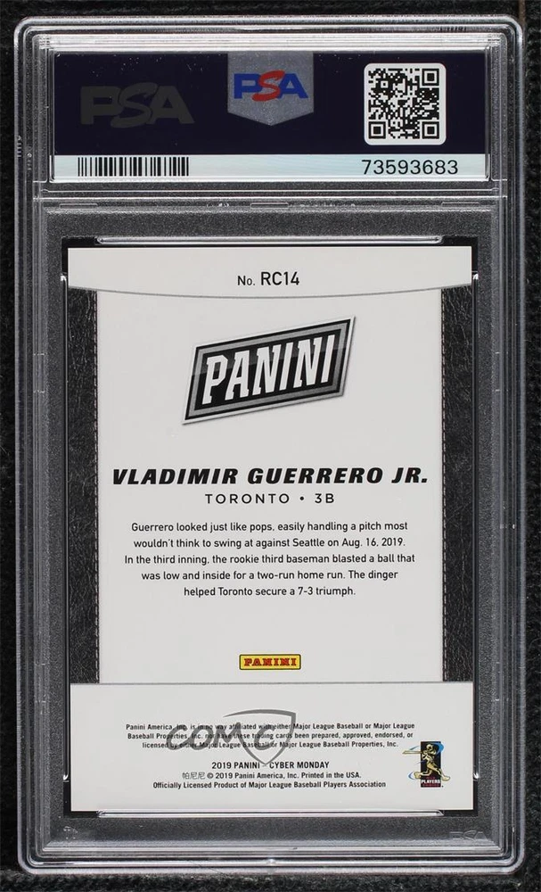 2019 Panini Cyber Monday - Rookies - Future Frames #RC14 Vladimir Guerrero Jr. Qty Made: 99 Graded PSA 10 GEM MT - Rookie - MultiSport Card - Featuring the Toronto Blue Jays - Featuring Vladimir Guerrero Jr. Search for more: 2019 Panini Cyber Monday Search for more: 2019 Panini Cyber Monday - Rookies - Future Frames View all of our Listings Auctions Buy It Now About Us Located in the beautiful Pacific Northwest, COMC (Check Out My Cards) is the world's largest consignment service for trading card singles. More than 10,000 people have used our consignment service to list over 50 million trading cards. We currently house 20 million cards, each listed for sale with front and back images of the actual card. Find out how we can help you consign your items on eBay by contacting us through eBay messaging. COMC -- "The Safe & Easy Way to Buy & Sell" Representative Image - Select Specific Item above to see image of actual item Representative Image - Select Specific Item above to see image of actual item Raw Condition for Modern Cards Unless otherwise noted, raw modern cards are listed in Near Mint-Mint condition or better. A NM-MT card appears to be Mint at first glance, but upon closer inspection, may exhibit some of the following: minor print defects (e.g. roller marks, print line, dimple), minor scratches, slight edge wear, and slight corner wear. Centering is clearly visible in the images provided and does not factor into our condition assessment. Raw Condition for Vintage Cards Unless otherwise noted, raw vintage cards are listed in Excellent condition or better. An EX card may exhibit some of the following: minor rounding of corners, surface wear, print defects, light scratches, and slight edge wear/chipping. Centering is clearly visible in the images provided and does not factor into our condition assessment. Domestic Shipping Combined shipping for multiple items is available. To receive combined shipping, please ensure all desired items are in your eBay shopping cart before proceeding to checkout. eBay limits orders to 40 items per order. We automatically combine multiple orders placed on the same day. If you place multiple orders on the same day, please contact us to request a refund of applicable shipping costs. Signature confirmation may be required on invoices over $400. Raw cards are shipped in toploaders. International Shipping COMC offers eBay's International Shipping (EIS) for international orders under $2,500* (see country exceptions below). All duties and import fees are paid at checkout; in the rare event that there are additional import fees upon delivery, these are borne by the buyer. EIS packages route through a shipping hub in Erlanger, KY before shipping to their final destination. Please note that EIS does not allow for combined shipments. The shipping rates are determined by eBay and cannot be adjusted. *Maximum sale price exceptions: Colombia, Kuwait ($2,000); Taiwan ($1,539); Chile, Costa Rica, Guatemala, Honduras, Trinidad and Tobago ($1,000); Antigua and Barbuda, Aruba, Belize, Dominica, Grenada, Philippines, Saint Kitts and Nevis, Saint Lucia, Montserrat, Turks and Caicos Islands ($500); Dominican Republic, El Salvador ($200). Please request a shipping quote through eBay messaging for orders that exceed the maximum sale price supported by eBay's International Shipping. You will be responsible for all duties and import fees for international orders shipped outside the EIS. Raw cards are shipped in toploaders. Payment COMC does not accept offers on our cards through our eBay storefront. COMC utilizes eBay’s managed payments system. If you are experiencing difficulties making a payment, please contact eBay for assistance. Return Policy Returns are only accepted on the rare occasion the item is not as described. If you are making a return, please initiate the return process through eBay so a mailing label can be provided for you. Prior to listing, our expert team carefully assessed this item to represent it accurately. Please review the description and high-definition images prior to purchasing to ensure this item meets your satisfaction. We welcome you to contact us if you have further questions about this item. Trust and Integrity COMC carefully assesses each item consigned to us to prevent fraudulent items from entering the marketplace. If you believe an item offered on COMC may be fraudulent, please contact us with details so we can investigate the issue. Items we determine are outside our supported items policy may be removed. Last Modified: 12/18/2024 1:49:11 AM PDT