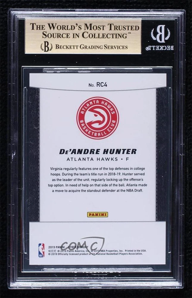 2019 Panini Cyber Monday - Rookies - Swirlorama #RC4 De'Andre Hunter Qty Made: 50 Graded BGS 9.5 GEM MINT - Rookie - MultiSport Card - Featuring the Atlanta Hawks - Featuring De'Andre Hunter Search for more: 2019 Panini Cyber Monday Search for more: 2019 Panini Cyber Monday - Rookies - Swirlorama View all of our Listings Auctions Buy It Now About Us Located in the beautiful Pacific Northwest, COMC (Check Out My Cards) is the world's largest consignment service for trading card singles. More than 10,000 people have used our consignment service to list over 50 million trading cards. We currently house 20 million cards, each listed for sale with front and back images of the actual card. Find out how we can help you consign your items on eBay by contacting us through eBay messaging. COMC -- "The Safe & Easy Way to Buy & Sell" Representative Image - Select Specific Item above to see image of actual item Representative Image - Select Specific Item above to see image of actual item Raw Condition for Modern Cards Unless otherwise noted, raw modern cards are listed in Near Mint-Mint condition or better. A NM-MT card appears to be Mint at first glance, but upon closer inspection, may exhibit some of the following: minor print defects (e.g. roller marks, print line, dimple), minor scratches, slight edge wear, and slight corner wear. Centering is clearly visible in the images provided and does not factor into our condition assessment. Raw Condition for Vintage Cards Unless otherwise noted, raw vintage cards are listed in Excellent condition or better. An EX card may exhibit some of the following: minor rounding of corners, surface wear, print defects, light scratches, and slight edge wear/chipping. Centering is clearly visible in the images provided and does not factor into our condition assessment. Domestic Shipping Combined shipping for multiple items is available. To receive combined shipping, please ensure all desired items are in your eBay shopping cart before proceeding to checkout. eBay limits orders to 40 items per order. We automatically combine multiple orders placed on the same day. If you place multiple orders on the same day, please contact us to request a refund of applicable shipping costs. Signature confirmation may be required on invoices over $400. Raw cards are shipped in toploaders. International Shipping COMC offers eBay's International Shipping (EIS) for international orders under $2,500* (see country exceptions below). All duties and import fees are paid at checkout; in the rare event that there are additional import fees upon delivery, these are borne by the buyer. EIS packages route through a shipping hub in Erlanger, KY before shipping to their final destination. Please note that EIS does not allow for combined shipments. The shipping rates are determined by eBay and cannot be adjusted. *Maximum sale price exceptions: Colombia, Kuwait ($2,000); Taiwan ($1,539); Chile, Costa Rica, Guatemala, Honduras, Trinidad and Tobago ($1,000); Antigua and Barbuda, Aruba, Belize, Dominica, Grenada, Philippines, Saint Kitts and Nevis, Saint Lucia, Montserrat, Turks and Caicos Islands ($500); Dominican Republic, El Salvador ($200). Please request a shipping quote through eBay messaging for orders that exceed the maximum sale price supported by eBay's International Shipping. You will be responsible for all duties and import fees for international orders shipped outside the EIS. Raw cards are shipped in toploaders. Payment COMC does not accept offers on our cards through our eBay storefront. COMC utilizes eBay’s managed payments system. If you are experiencing difficulties making a payment, please contact eBay for assistance. Return Policy Returns are only accepted on the rare occasion the item is not as described. If you are making a return, please initiate the return process through eBay so a mailing label can be provided for you. Prior to listing, our expert team carefully assessed this item to represent it accurately. Please review the description and high-definition images prior to purchasing to ensure this item meets your satisfaction. We welcome you to contact us if you have further questions about this item. Trust and Integrity COMC carefully assesses each item consigned to us to prevent fraudulent items from entering the marketplace. If you believe an item offered on COMC may be fraudulent, please contact us with details so we can investigate the issue. Items we determine are outside our supported items policy may be removed. Last Modified: 10/20/2024 3:17:11 AM PDT
