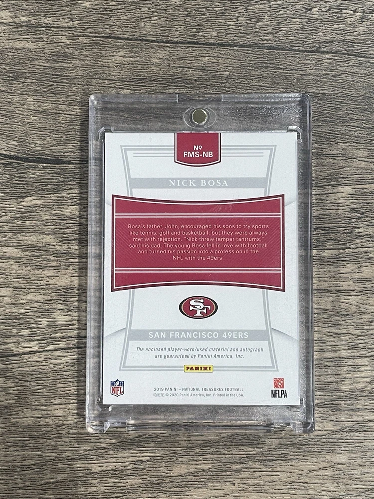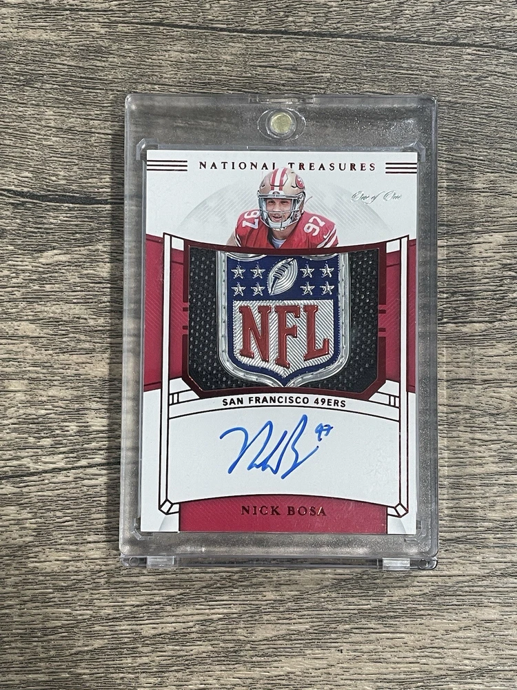 This rare and highly sought-after 1 of 1 Rookie 2019 Panini National Treasures NFL Shield trading card features an autographed rookie patch of San Francisco 49ers player Nick Bosa. With a print run of only 1, this card is a must-have for any serious football card collector. The card is part of the NFL Shield parallel/variety and is ungraded. Nick Bosa best card! The card is manufactured by Panini and includes features such as the player's name, team, and card number (rms-nb). It is a great addition to any sports trading card collection and is sure to impress. Don't miss your chance to own this unique piece of football memorabilia. DM All Offers